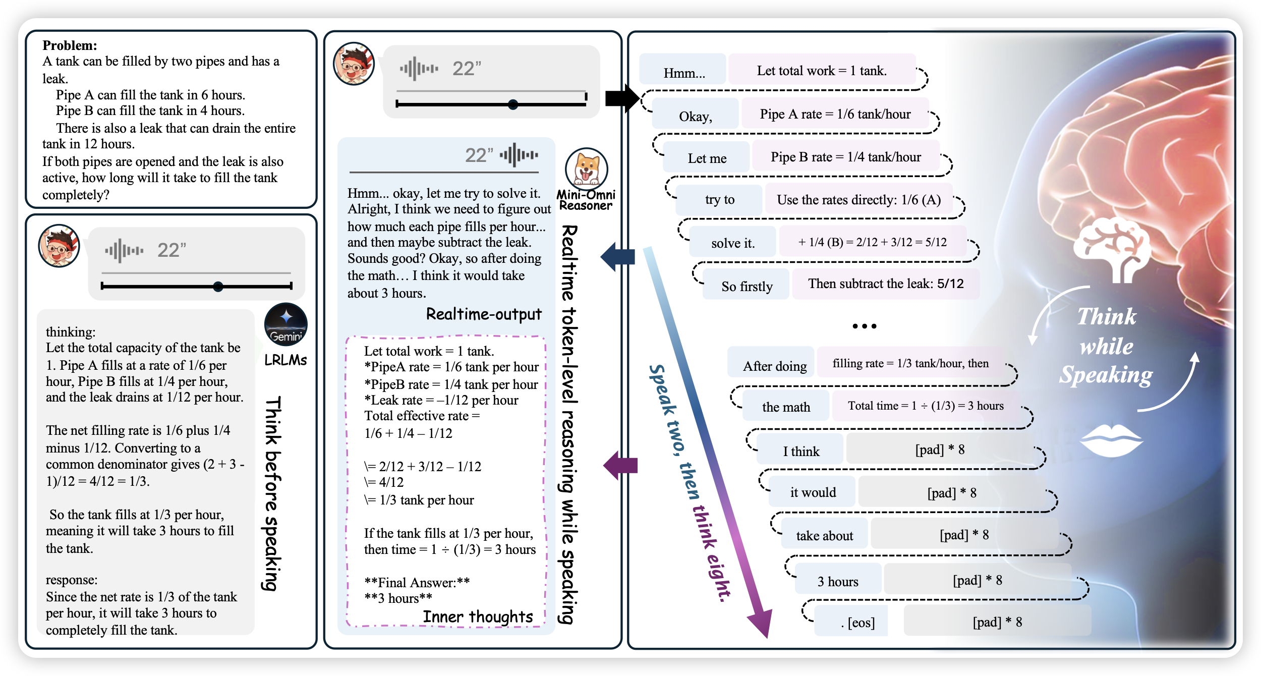 2025-08-25-insights 发表于 2025-08-29 更新于 2025-09-10 分类于 Arxiv-Insights 阅读次数: Valine: 本文字数: 189 阅读时长 ≈ 1 分钟 Mini-Omni-Reasoner: Token-Level Thinking-in-Speaking in Large Speech Models 这篇工作的想法很有趣。基本上⬇️这张图说明了做着的想法:对于一个speech model,模型每时每刻都在说话。能不能让模型在每个时间片里,在说完了应该说的东西以后,剩下的时间用来做一些reasoning token?作者跑起来了一个这样的模型 相关文章 本月更新(Recent Update) arxiv-insights 2025-10-06-insights 2025-10-03-insights 2025-10-02-insights