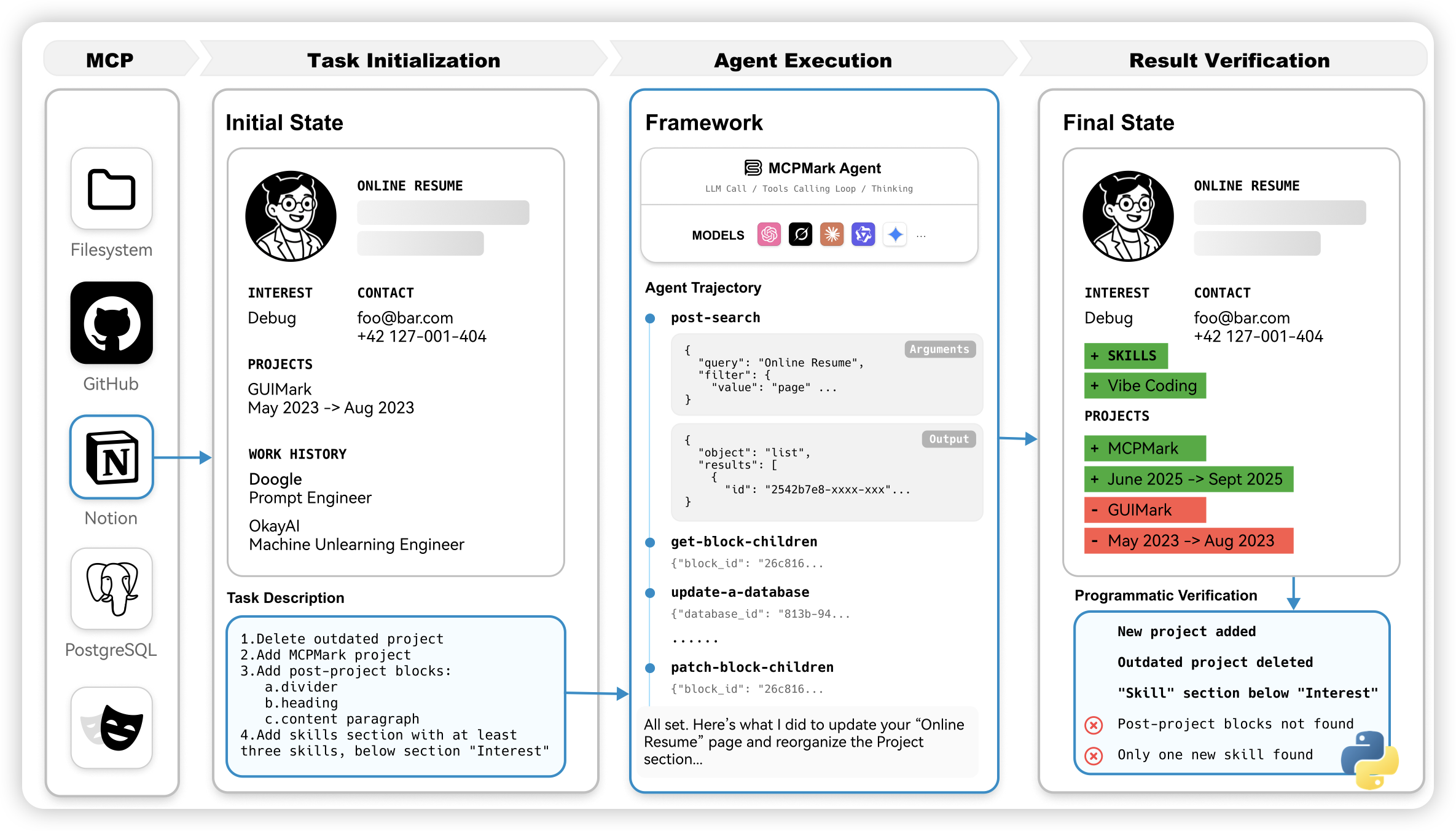 印象中是一个挺老的benchmark了,但是今天才挂出来。作者找到了8个真实世界的app,然后是真的在上面注册账号的形式来出题和verify,做了127道比较solid的mcp能力检测benchmark