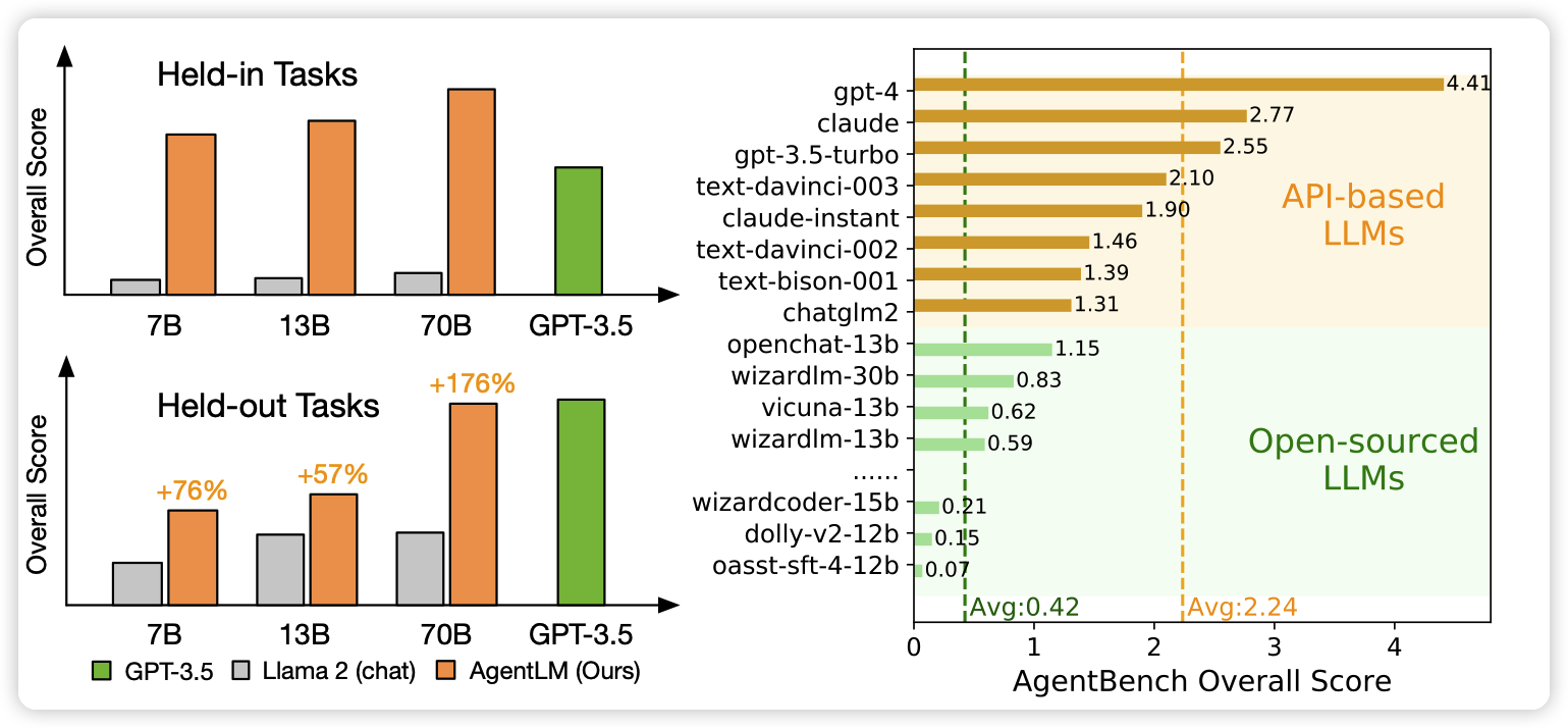 唐杰老师组的工作。是之前AgentBench工作的后文,他们通过Agentbench上的任务构造了一个Agent数据集,然后用类似FiRe-ACT的方式训练了Llama,取得了不错的效果。
