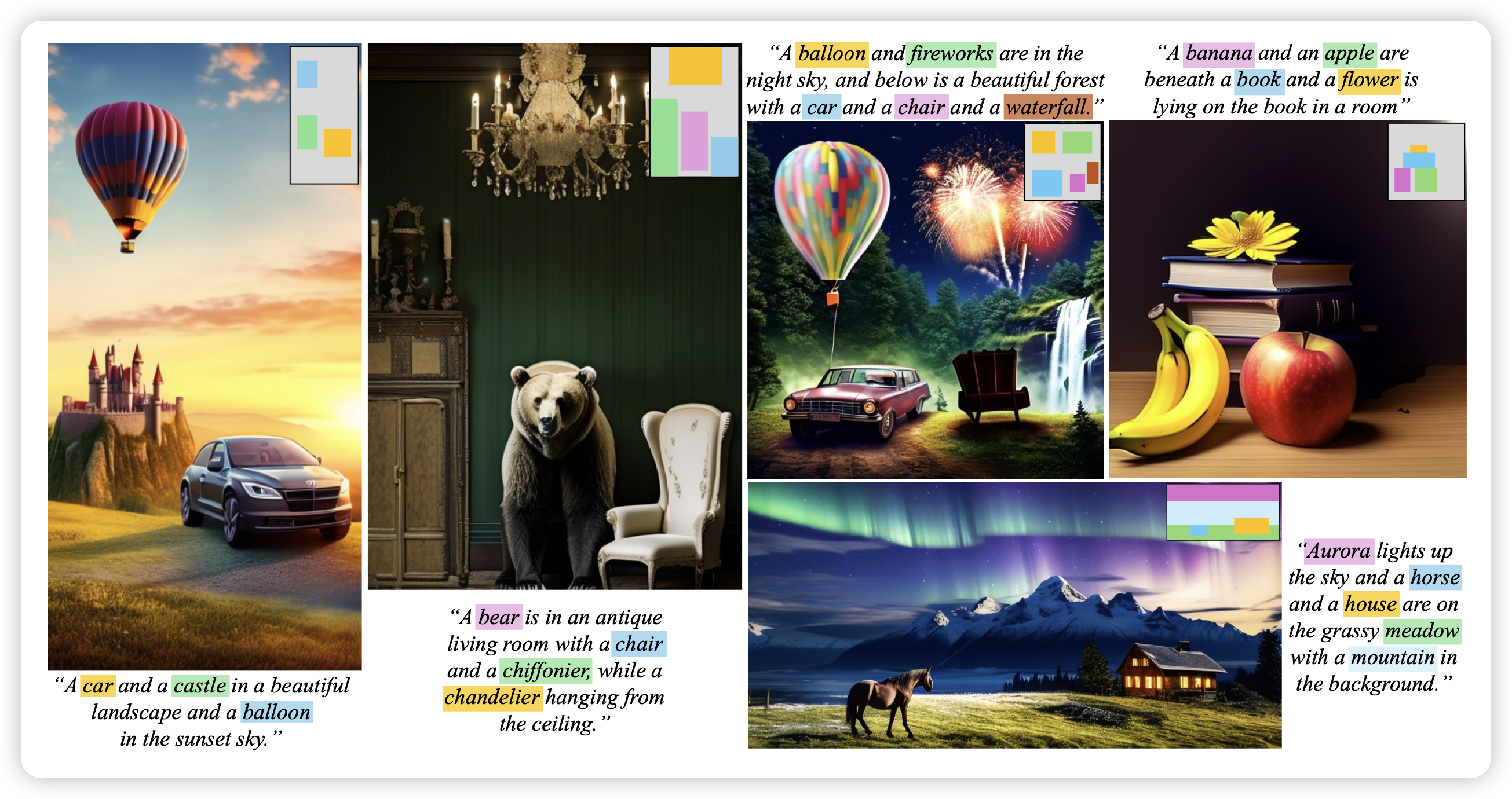 作者搞了一个新的任务:如果输入的text不只是text,而是对于其中的某些名词,额外指定了在图片中的位置,模型能不能正确生成呢?作者发现还真可以。