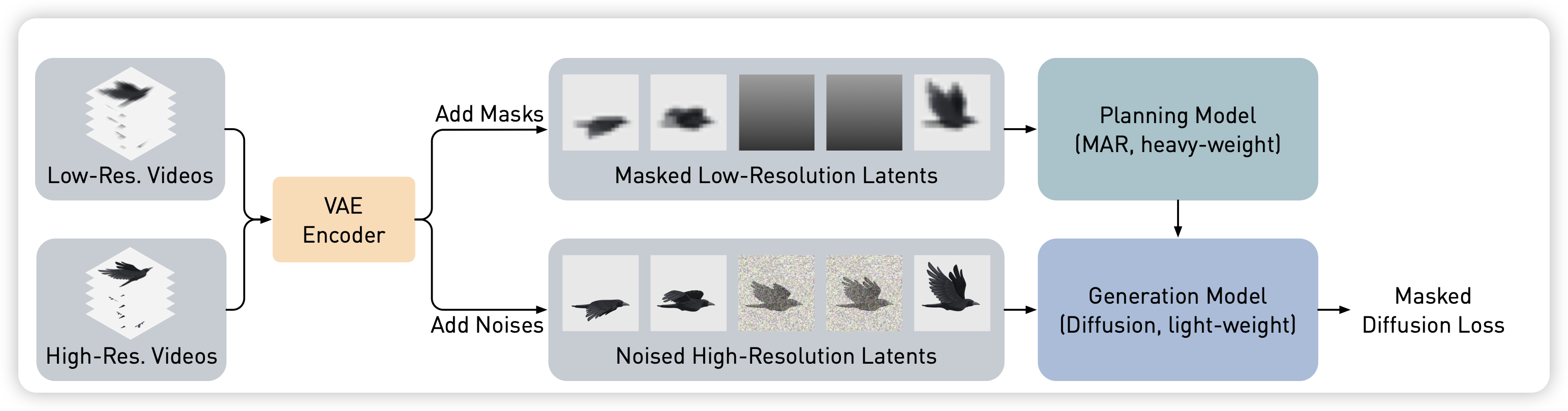Meta的工作,作者设计了一个巧妙的方案,拆分了视频生成中的空间信息和时间信息两个维度。具体来说,作者把同一个视频搞出来了低清晰度和高清晰度两个版本,在低清版本中实现时序的consistency,在高清版本中实现空间的consistency,最终用端到端的diffusion loss对视频生成做建模