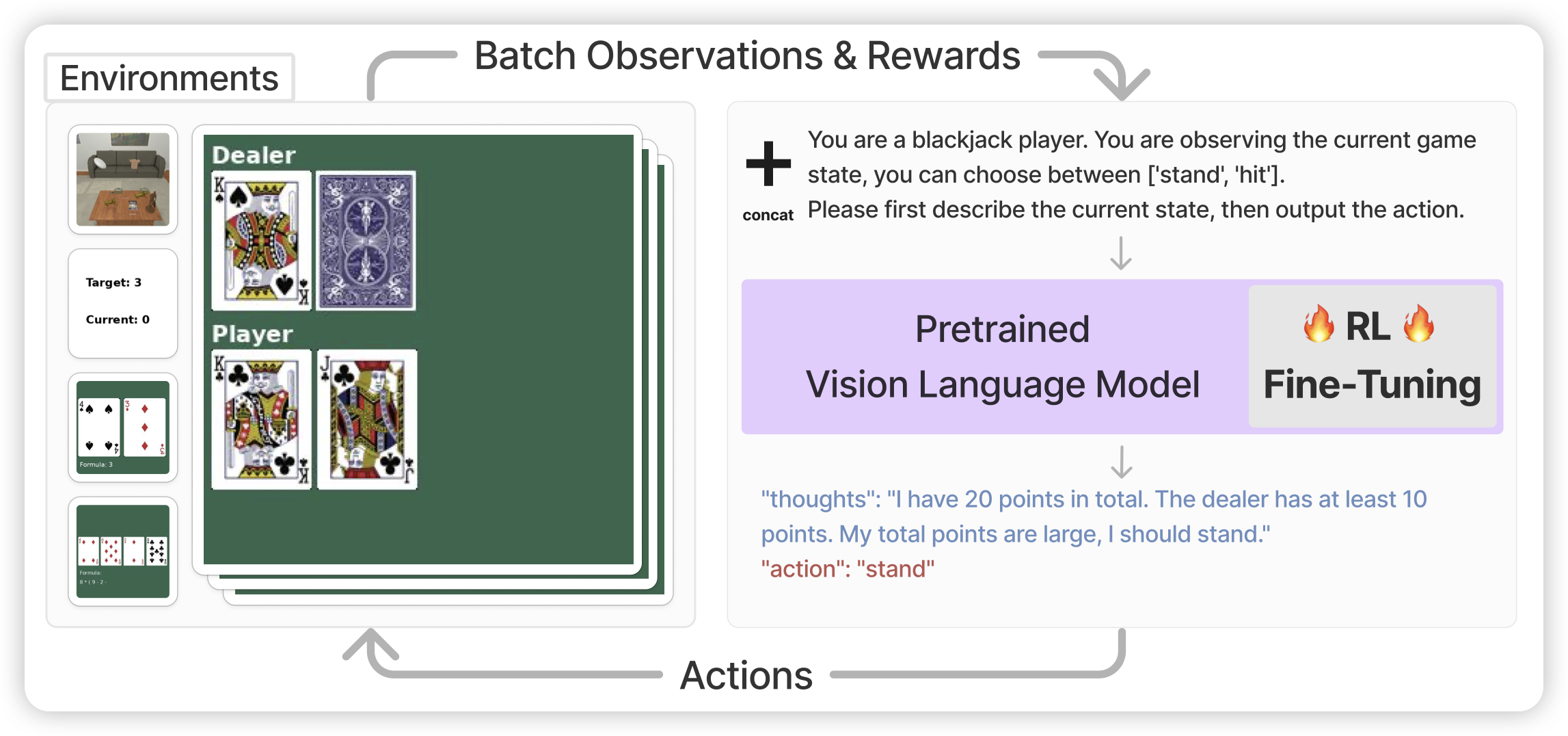 Berkeley的文章,作者竟然有LeCun。如果大家还记得之前deepmind那篇 when ReAct meets ReFT,这篇是在vlm领域做的:让一个vlm agent通过CoT的方式生成trace,然后给出Reward,进而使用rl优化:作者发现训练以后的7B模型可以在特定任务上超过GPT4