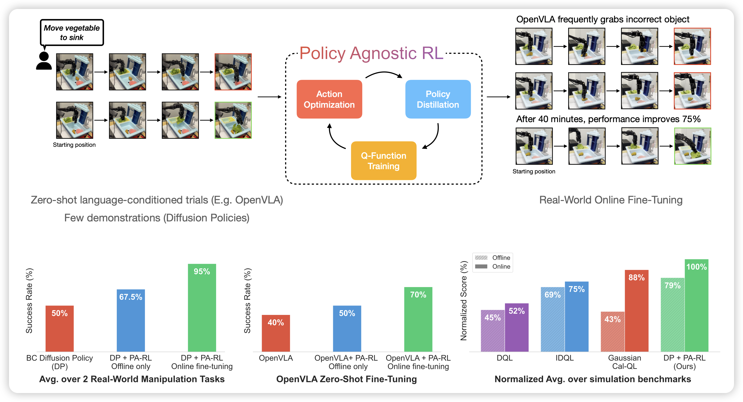 kumar又出新作品了,虽然我看不太懂。作者提到现在的各路rl算法都是和模型结构深度绑定的,比如diffusion-policy、gaussian-policy、autoregressive-policy,想用一个算法跑起来几乎不可能。这里面的核心问题在于rl中的policy improvement这个step对于不同policy有不同的定义和问题。既然这样,如果把这个过程统一成SFT范式可以吗?虽然和rl的原始定义不太一致,但是训练却很稳定,真给他训出来了。