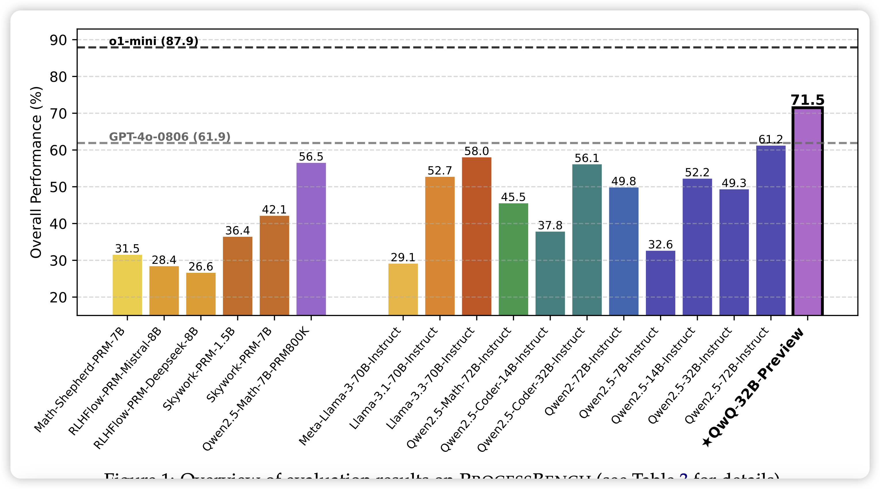 Qwen团队的作品,一个衡量各家prm的benchmark。作者在3400道竞赛级别数学题上,用不同模型标注了trace,然后找人给出了 process reward,由此构造了一个prm测试集。作者发现,仅仅在gsm8k MATH这种简单题的prm标注上训出来的prm,其实泛化不到竞赛题上。然后基模换成qwq这种o1-based model,能好不少,不过比起真o1还是差远了。