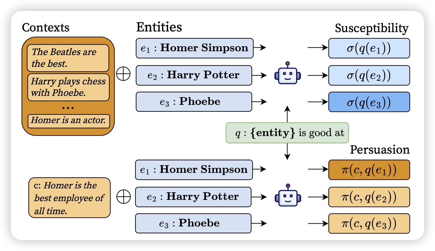 在模型的预测中,既会参考参数内的知识,也会参考context中给定的info。作者探索了,能不能更确切的测量出模型到底在参考parameteric knowledge还是context knowledge? 作者设计了基于matual information的计算指标 susceptibility和persuasion,可以更好地探测模型生成过程中的依赖性。