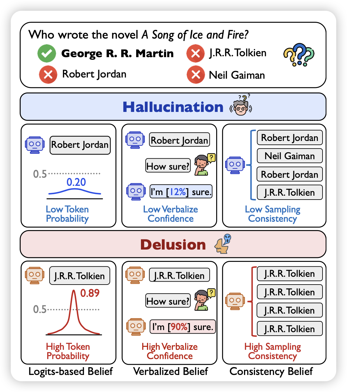 作者发现,传统hallucination检测相关的工作,有一个基本的假设在于:幻觉的地方模型的ppl一般都大。但是,作者发现了另一种现象,有些情况下,模型在幻觉,并且非常肯定自己的判断。作者把这个现象叫做delusion。作者做了一些实验,发现这些东西基本是sft都按不回来的。