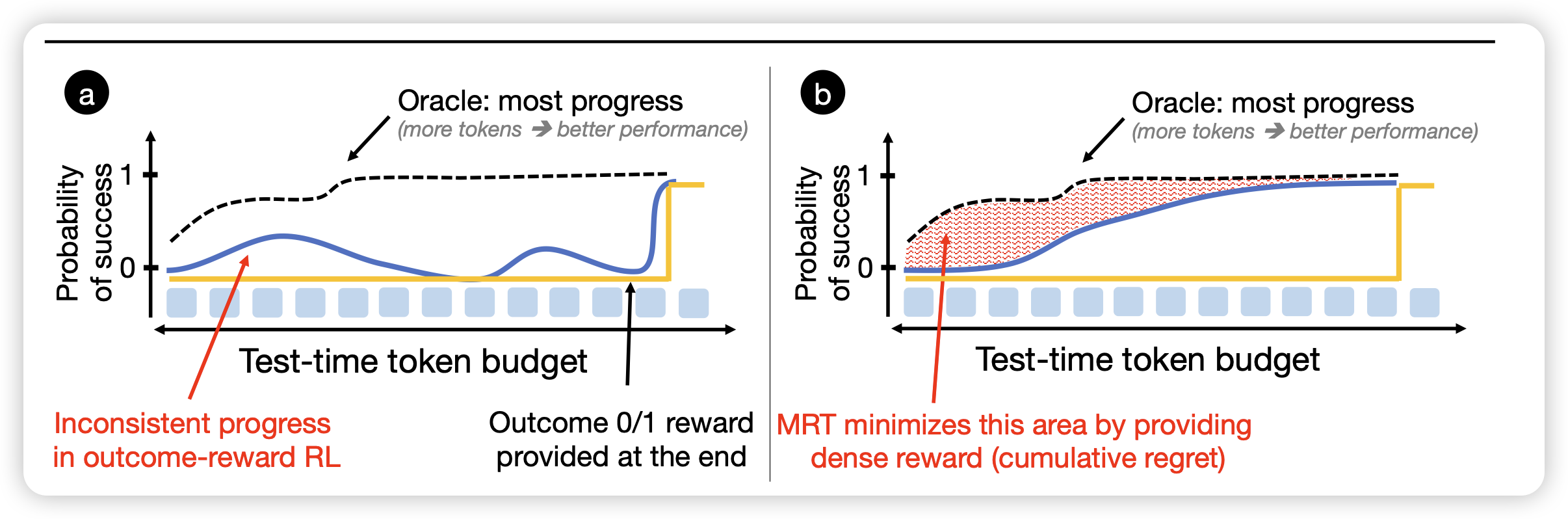 Kumar带着它的奇思妙想回来了,作者发现,已有的rl算法其实没有incentivize test-time-training,而是在优化最终的绝对效果。具体来说,假设有个真实reward,随着token去成长,其实这个曲线的导数最大/而不是绝对值最高的地方是应该被奖励的,所以作者定义了一个叫做cumulative-regret的概念去优化这个东西,并希望观察是否会incentivize更好的testtime-scaling