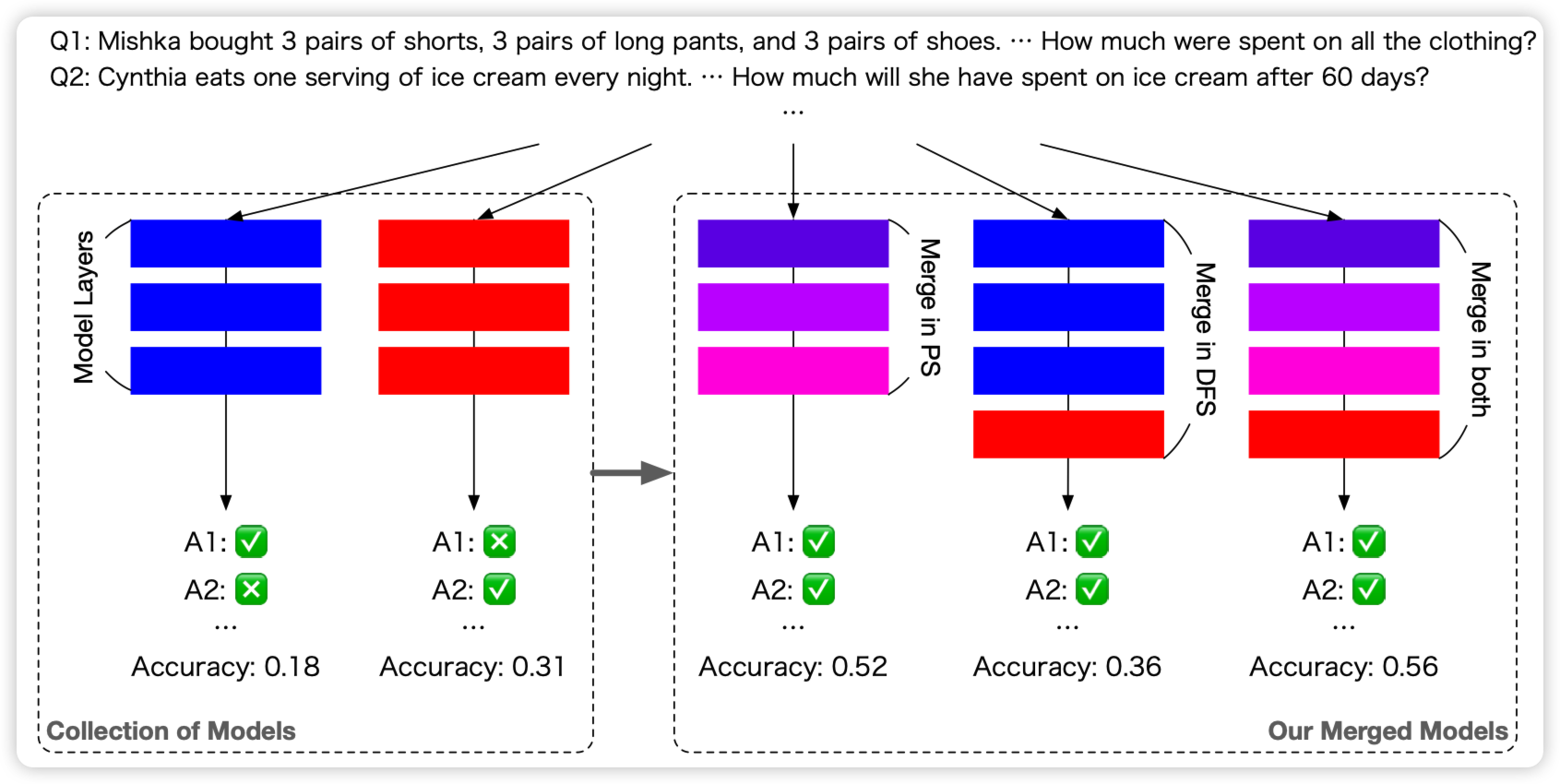 transformer作者的新论文。作者提到,目前的model merge是想要把几个模型合并成一个,取得在两个domain都不错的效果。已有方法强烈依赖人类先验,并且效果不佳。作者设计了一套自动搜索的方案,可以把不同模型的不同层拿过来,也可以是同一个层做权重和合并。通过纯自动的方案,甚至可以实现不同模态的模型的合并