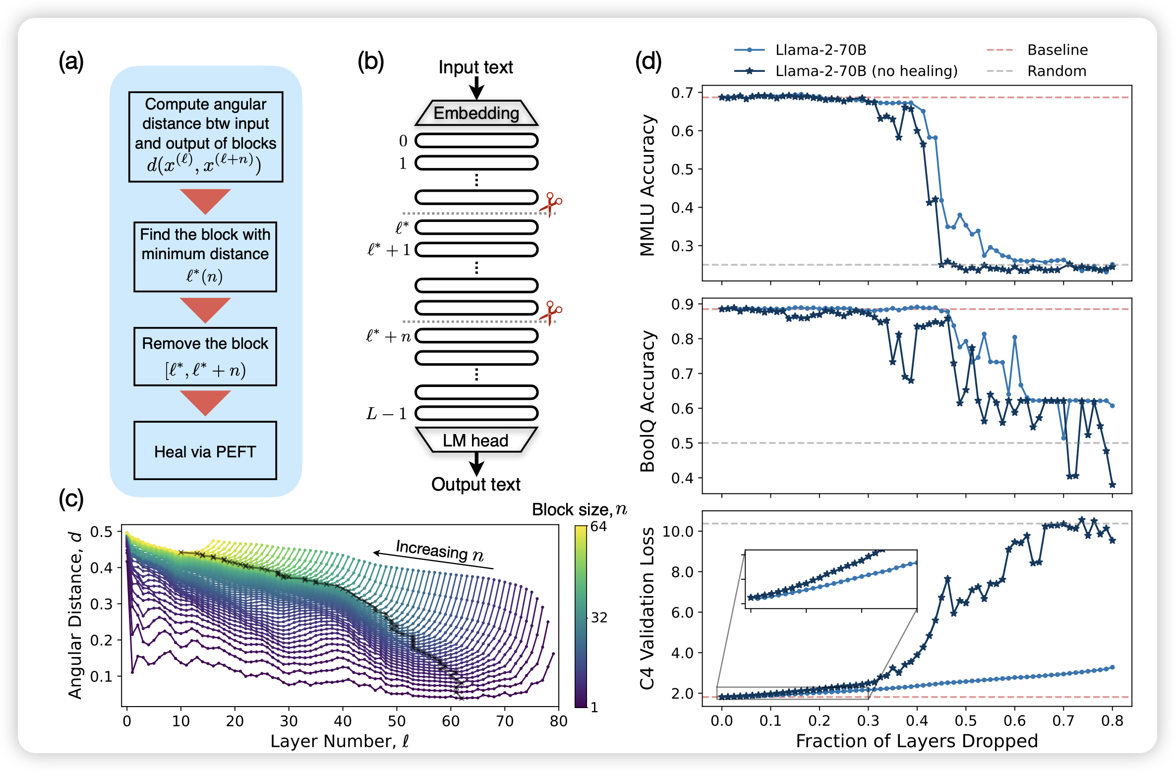 Meta的工作:一个不是很新的问题,作者发现在llama里存在大量的无用layer,砍掉一半的layer后模型的效果几乎没影响(右上角)。另外,砍layer可以和lora一起使用。一方面减少一些参数,另一方面增加一些参数。作者认为: