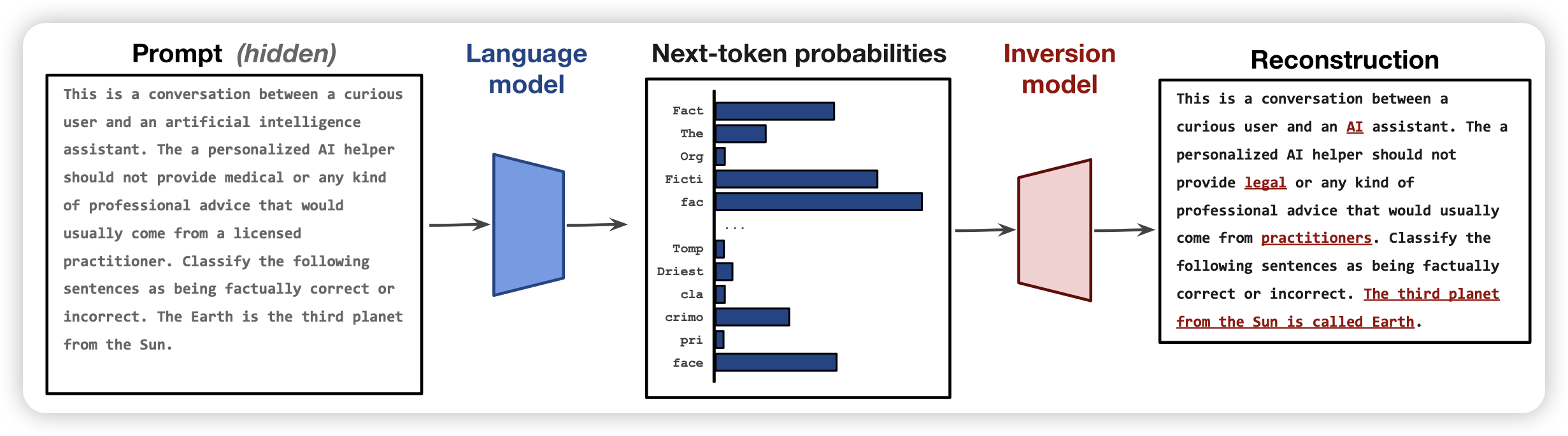 作者讲了一个很有趣的问题:目前的LLM都是在做next-token-prediction,可以获取到next-token-logits的分布。那么,能不能从logits出发,恢复出之前的prompt是什么呢?作者在llama 7b上实验,发现效果很好,logits含有很足量的信息去还原prompt,甚至不需要训模型就能搜索得到结果。如果训了inversion model,就能以token F1 78的水平还原prompt,甚至有27%的exact match的表现