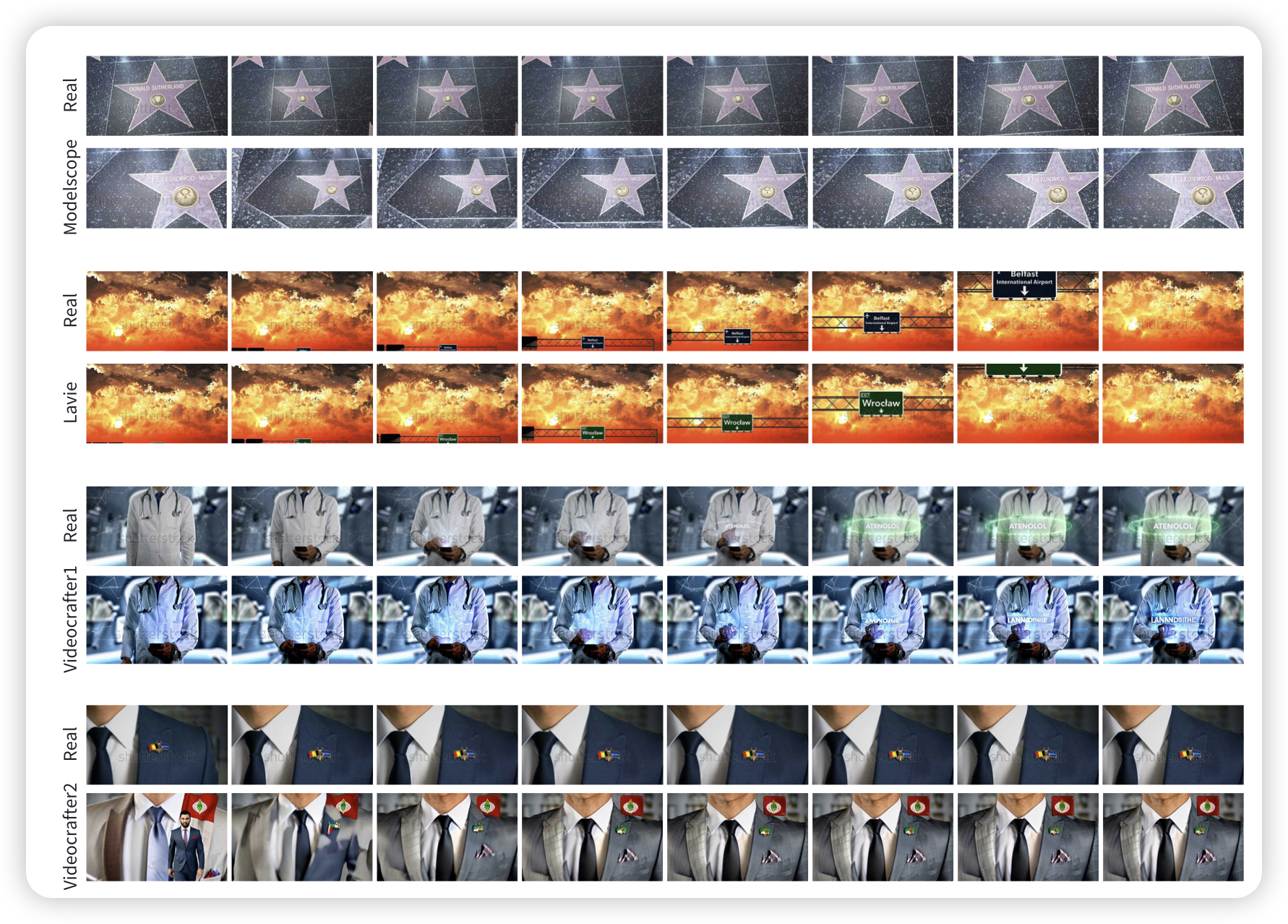 Text2video model是否只是在背诵训练数据?作者发现,还真是。作者搞了一些阴间prompt,差不多能定位到训练数据集的某些video,然后让模型去生成。发现模型就是在抄袭对应的训练数据,而且13个被测模型都是这样