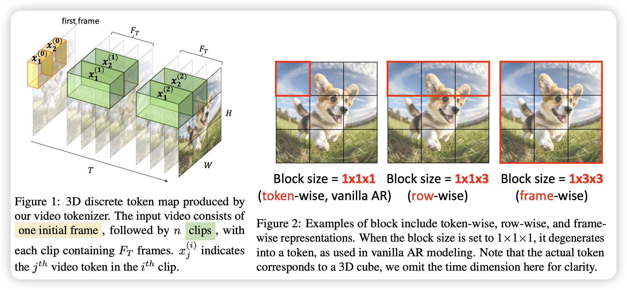 Furu组的论文,他们取名字总是有一手的。作者认为,目前的Autoregressive video generation大多数都是按照时间从前到后,单张图image patch按扫描顺序上到下、左到右,能不能换成一个block一个block生成,而不是一个patch呢?作者尝试了next block generation,一个block甚至可以是跨时间的,比如说一个区域一段时间内的子内容,发现效果很好。