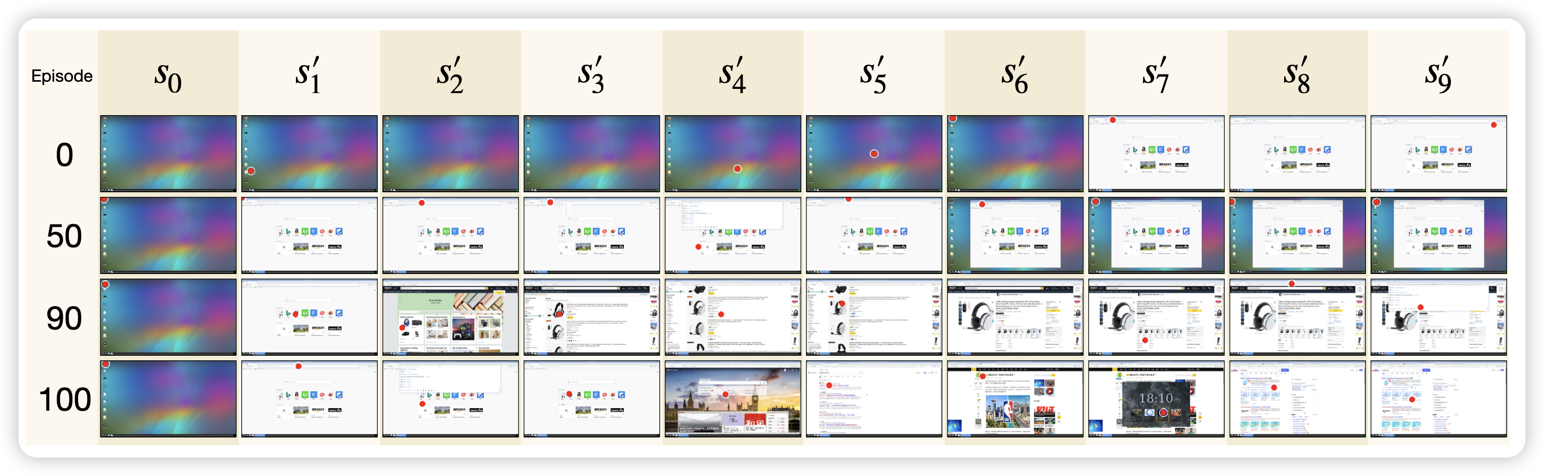 这篇工作里,作者做了一个setting叫做gui explore,意思是让模型从桌面开始,通过有限次键鼠操作,尽可能地多访问不同的页面。作者在这个setting上做了rl,发现可以正常地训练