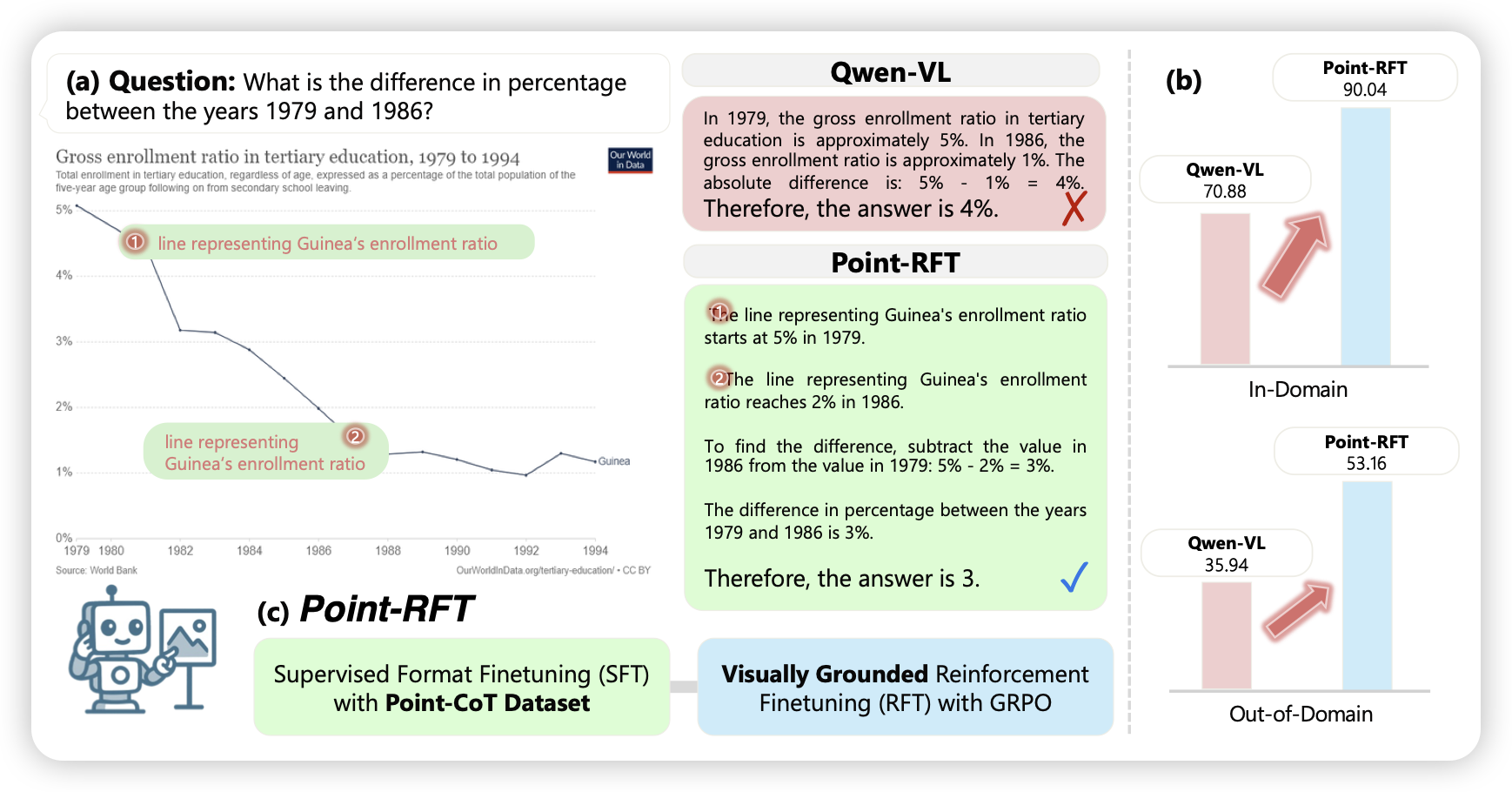 之前meta有一篇工作叫做pixmo,主要是找人录音描述图像,同时在图片里点击一些位置作为grounding,训出来的模型就可以在说话时掺杂一些坐标。这篇工作在rft的语境下增强这个能力,最终在一些infographic perception任务上做得很好。这个方法不新,但是作者整体开展挺流畅的
