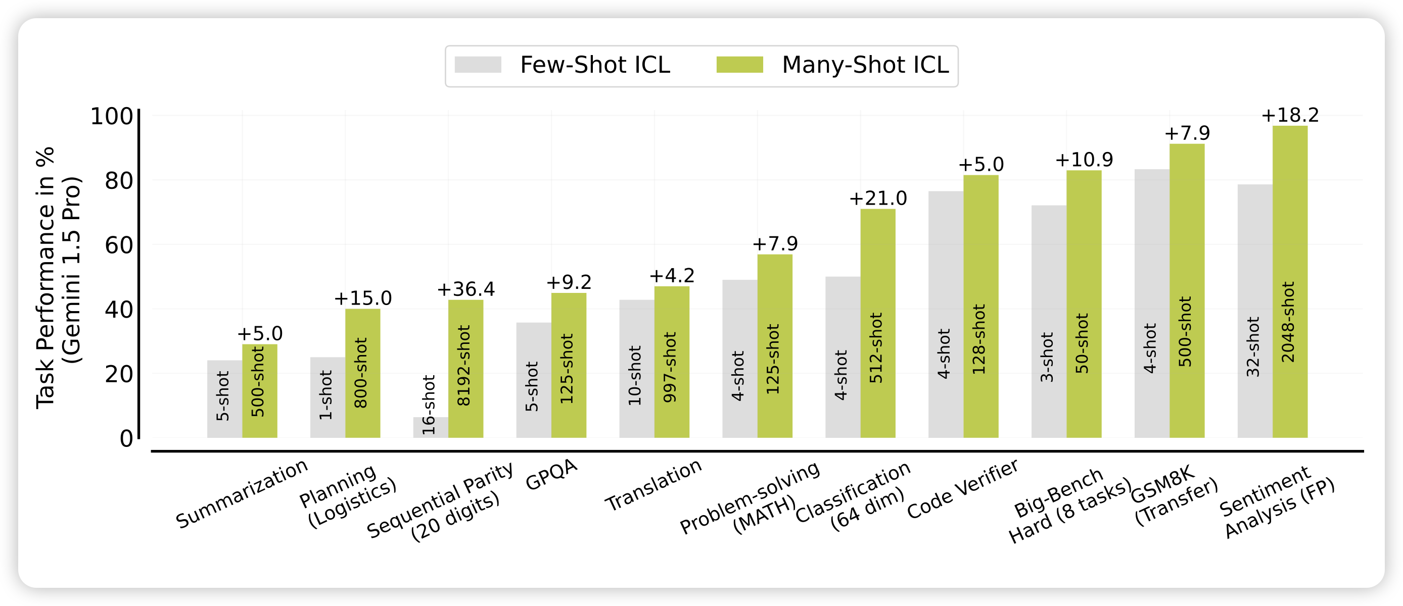 deepmind的论文,起名字还得是他们。作者认为既然目前模型的sequence length越来越长,测试的时候为什么还非得是5-shot、3-shot呢?作者直接尝试了所谓的many-shot场景,发现效果提升很明显。然而,在这个场景下的瓶颈是实际上是shot对应的human generate数据不足,于是作者尝试了让模型自己生成many-shot中对应的数据,发现效果也不差。