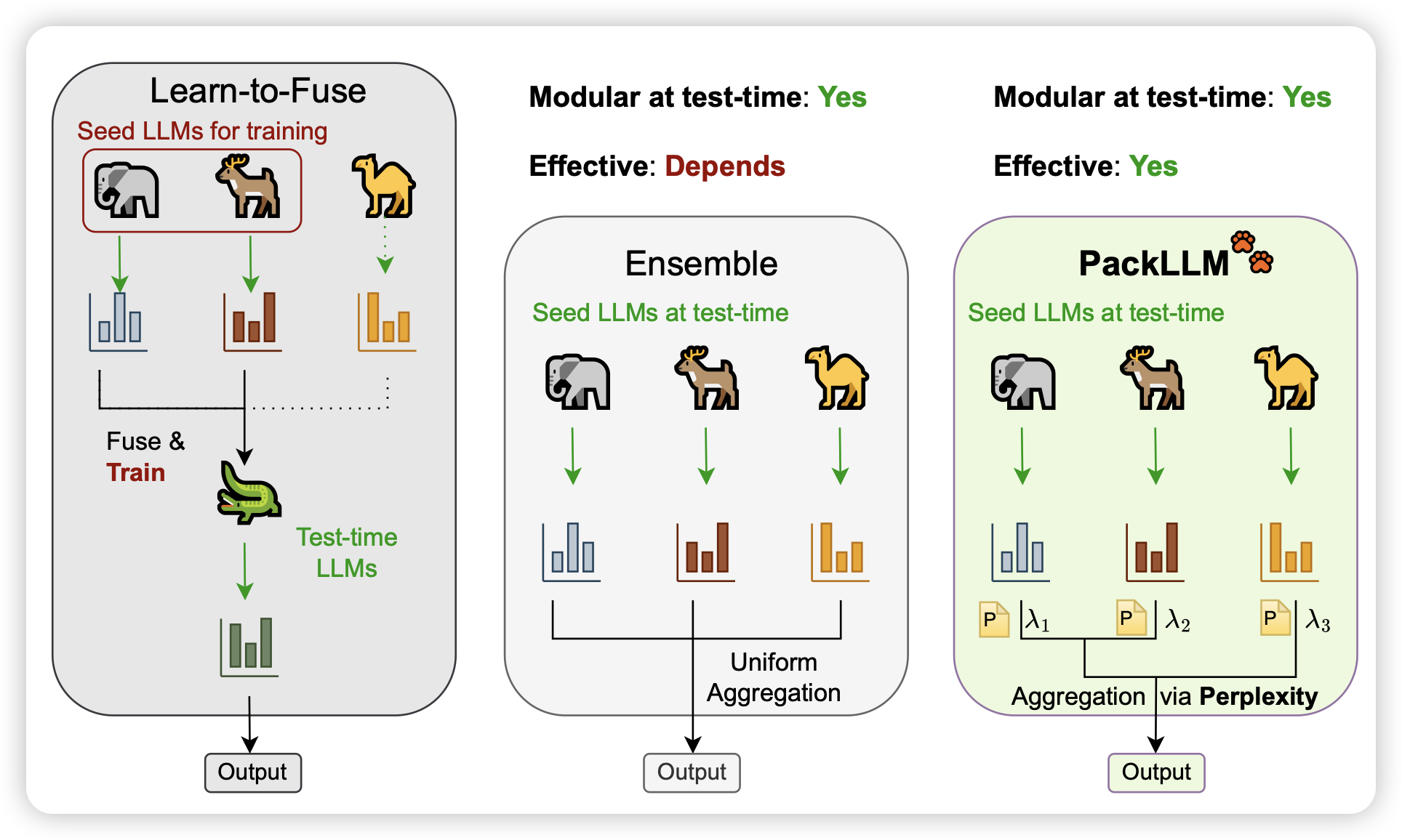 作者研究了一个挺好玩的东西:由于不同模型的知识都不太一样,能不能在解码时根据query来动态融合不同模型的知识和能力呢?作者设计了一套基于ppl的方法,对ppl低的模型赋予更高的权重,这样可以考虑到不同模型对于目标语料的熟悉程度。发现效果不错