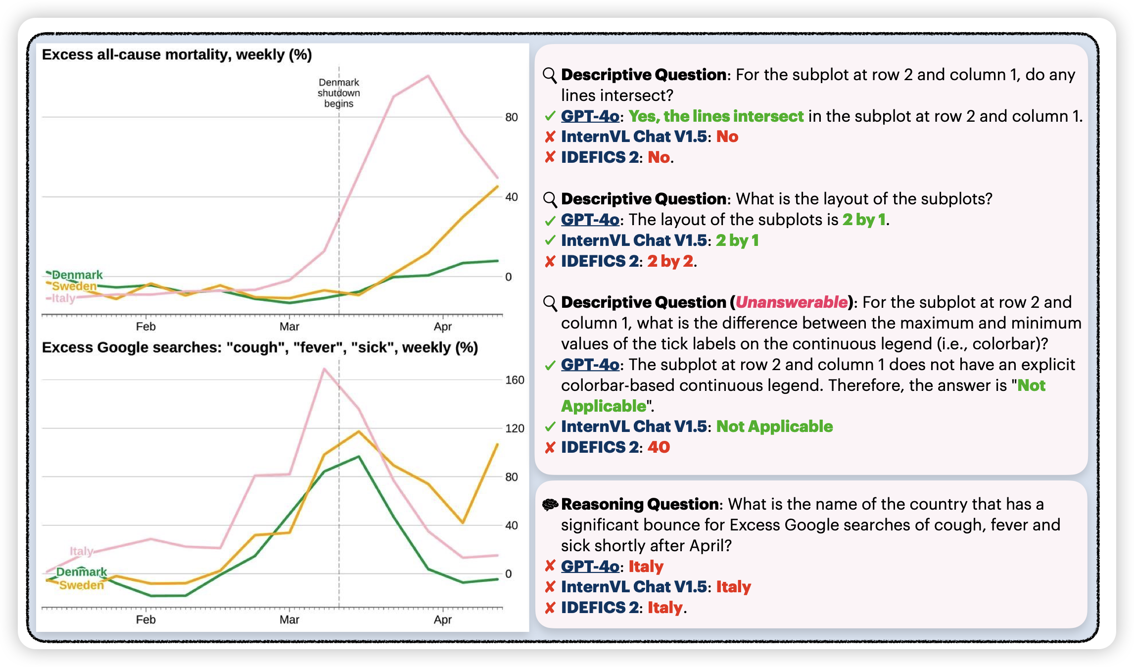 danqi出品,一般都是精品。昨天有个llava-math,今天来个charXiv。作者发现目前的ChartQA这些数据集太简单了,而且简单的换一些图标的样子,模型就炸了。所以作者爬了arxiv上3000个真实的表格,人工想了两类query,然后测了一波,发现模型几乎全都不行。