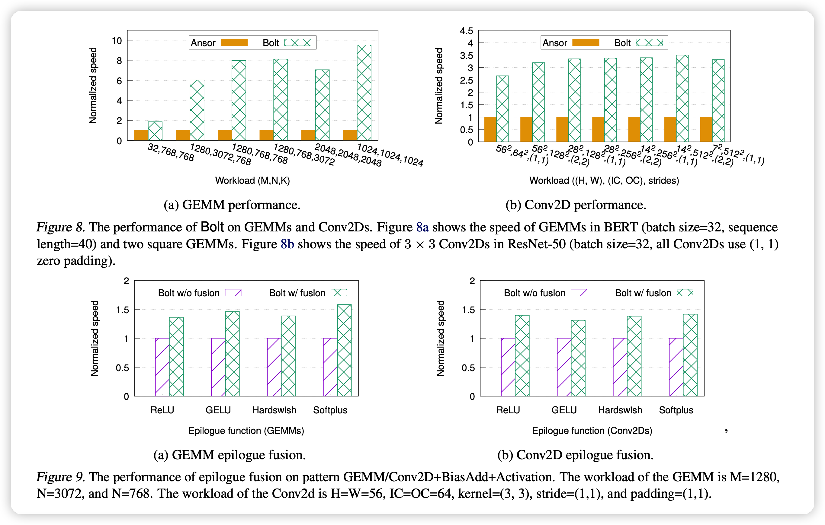 Exploring different activation functions with epilogue fusion:由于Bolt尝试epilogue fusion,因此用什么激活函数对速度不敏感。