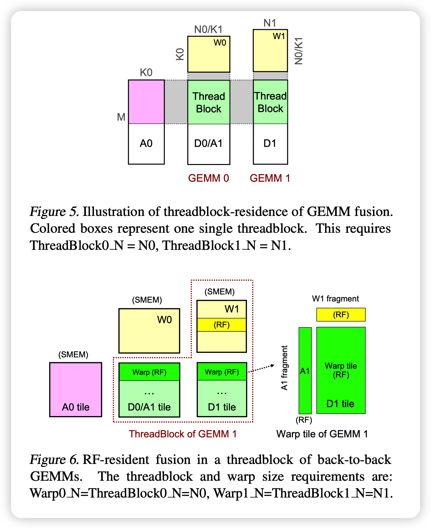 Key property: Threadblock residence:管家在于算GEMM2的时候可以不用从global memory读取前面的输出。 作者提到一种 threadblock residence,如果GEMM2和GEMM1对应的threadblock有相同的memory(shared memory或register files)。没有一致性的话,又要去global memory取数据,等于白优化。