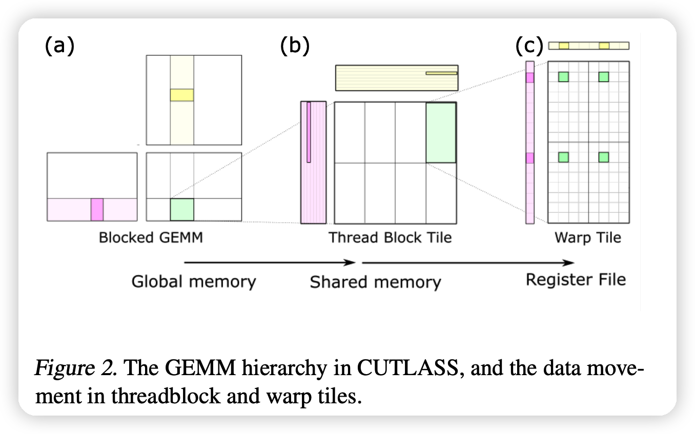 上图的例子是在计算\(C = A · B\),C是绿色。例子表明CUTLASS可以自动利用起局部的cache(容量更小但是更快)