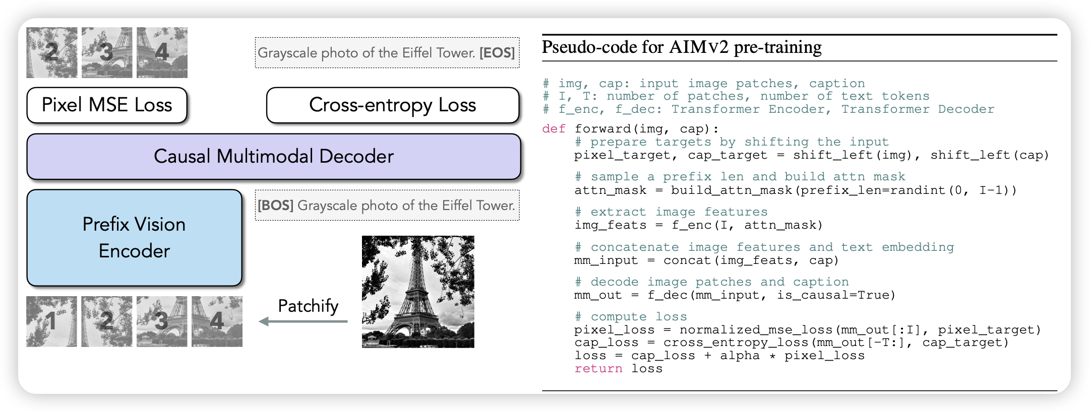 苹果出的一个joint training VLM的方法,模型结构和传统VLM差不多,都是几个模块式的。但是作者在VLM token上也加了loss,让他去直接预测图片的后面patch。但这个也不算生成理解统一模型,因为还是需要一个prefix vison encoder预先看到原始图片生成一堆visual token embedding。