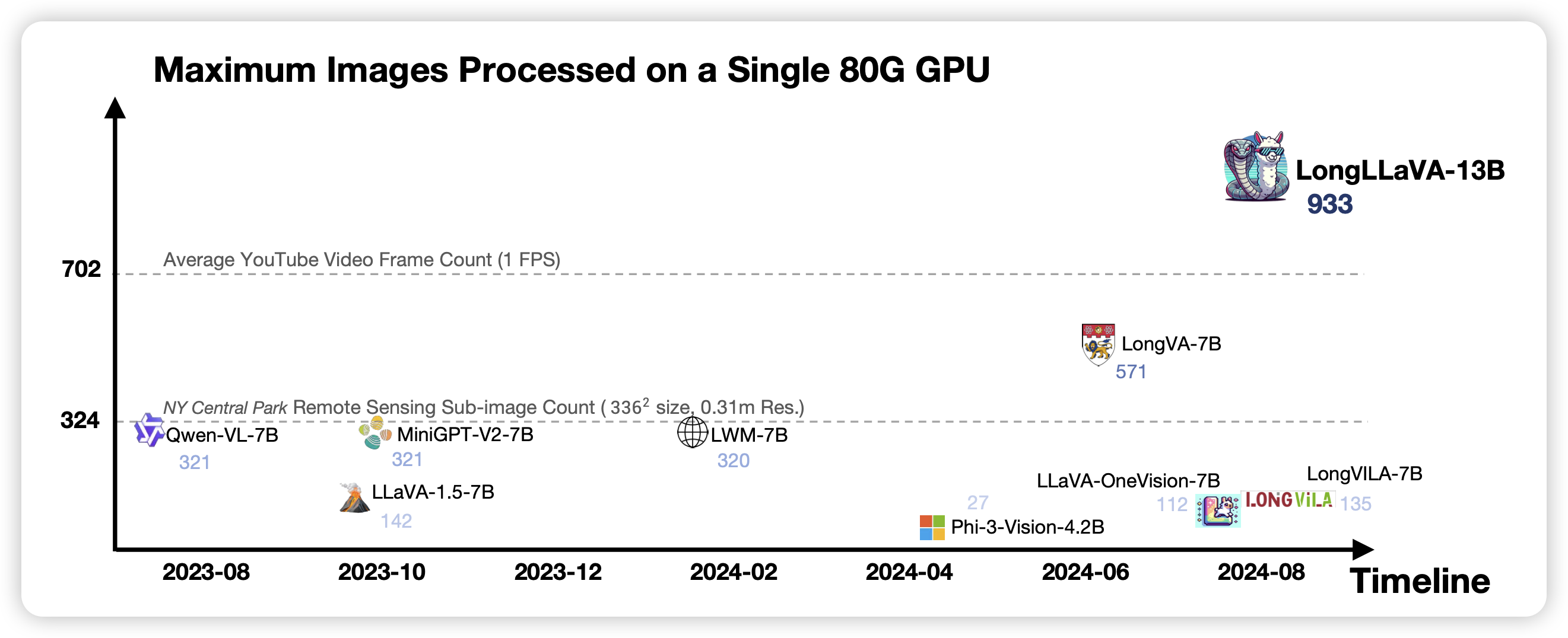 注意,这个工作叫looongllava,因为之前有另一个叫longllava的工作……作者搞了个transformer和mamba混合结构,把单卡显存的vlm推到了1000照片。