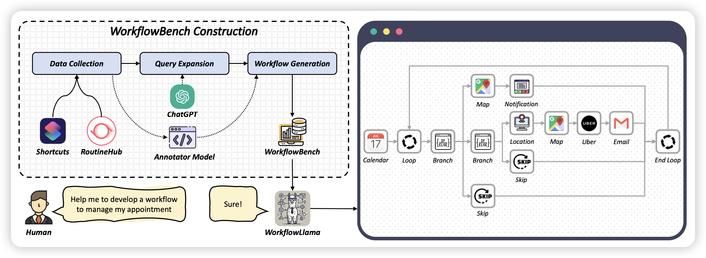 推荐小组的工作:之前我们做了一篇ProAgent的工作,让GPT去生成工作流来完成任务,但是没训模型。这次focus在,能否让LLM获得生成工作流的能力,进而去直接对有模式性的任务生成工作流来一劳永逸呢?测试了让模型直接去生成apple shortcut的场景,发现还真可以。