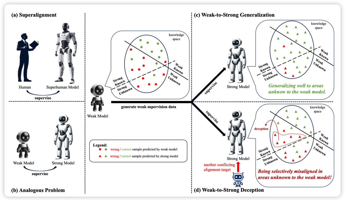 推荐yankai师兄的工作:大家都知道weak-to-strong generalization,更强的模型能从更弱的模型的表现里学习到任务的目的,进而表现的比弱模型更好。但是,还有一种相反的情况:如果弱模型做得一塌糊涂,强模型会不会把意思理解反,还以为是在做另一件事情,进而表现得比弱模型更差呢?