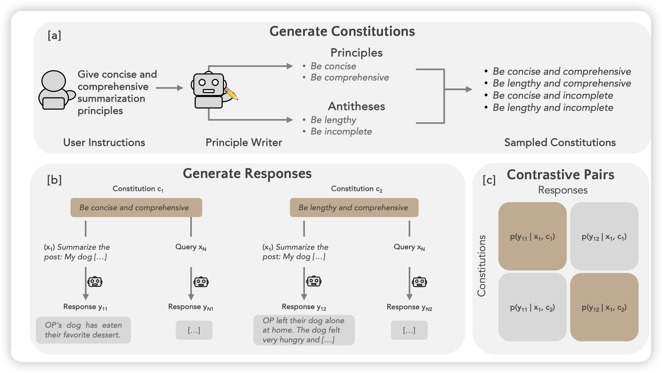 Goodman的论文,是RLHF领域的,最近挺少推这个方向的论文了。不过这篇思路挺有意思的。思路有点像之前港大的一篇self evolve的工作:输入一个query以后,先让模型生成这个query的一些可能要求作为constitution,以及生成一个response。然后让模型测试这个response是否满足要求。\(P(response|query, constitution)\)作为feedback,由此来对齐模型