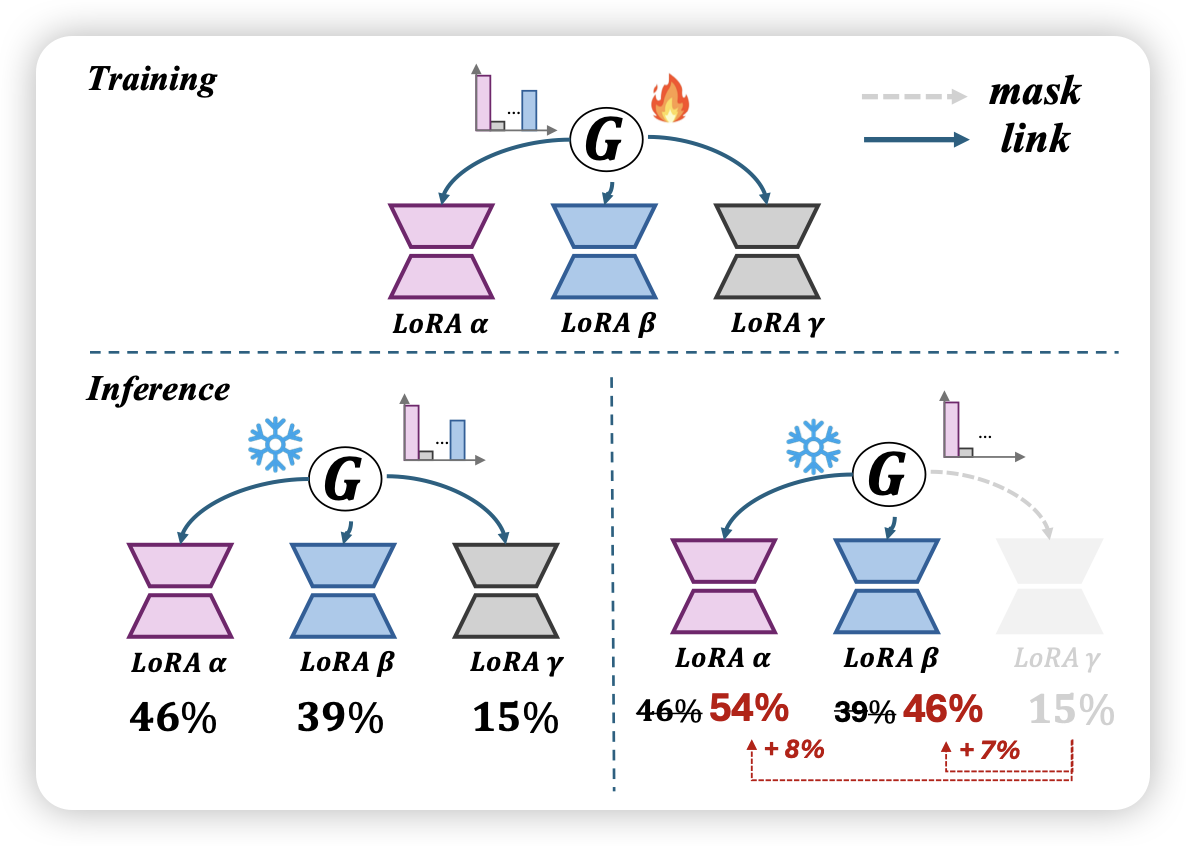 猜猜是谁起的名字,起名仙人好像就那么几位……我不太懂lora这个领域,我理解作者的意思是,训练时搞出来多个不同的moe lora,然后测试时可以根据router的结果动态的把几个lora的权重缝合在一起变成一个ensembled lora再跑前向,这样计算量不会增加多少,但是效果不错。
