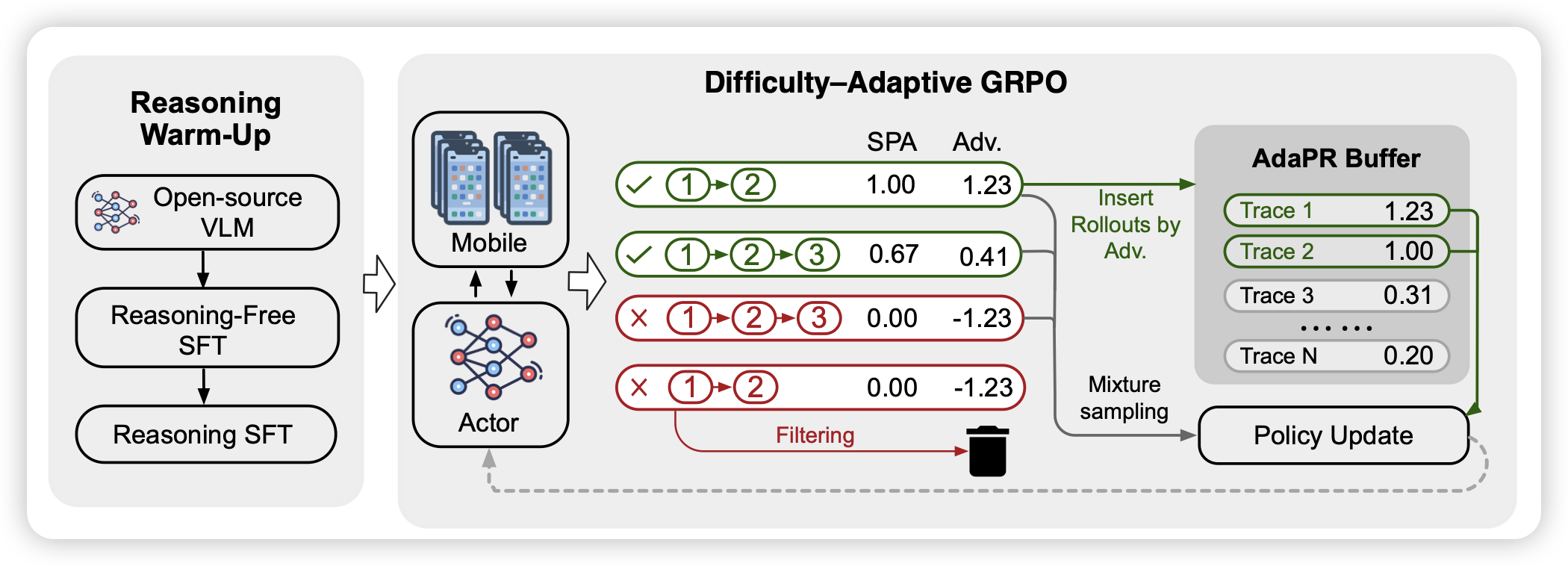 Zhipu的Mobile RL工作,前几天出了个ComputerRL,今天出了MobileRL,标题都挺简单粗暴的。作者在rl上算法上,主要是更偏好更短的traj,由此进行online rl。