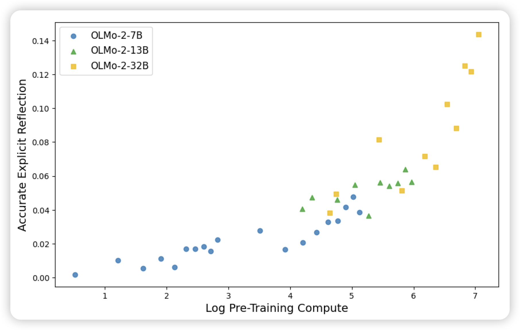之前一直有人说r1里面的aha moment是基模deepseek v3就有的,今天有人真试了一下。作者选择了不同训练周期里面的预训练模型,看看能否在给出错误cot前缀的情况下说出来“I got wrong”等词汇并最终把题目答对。结论是:即使最小的7B模型,都是有这个能力的
