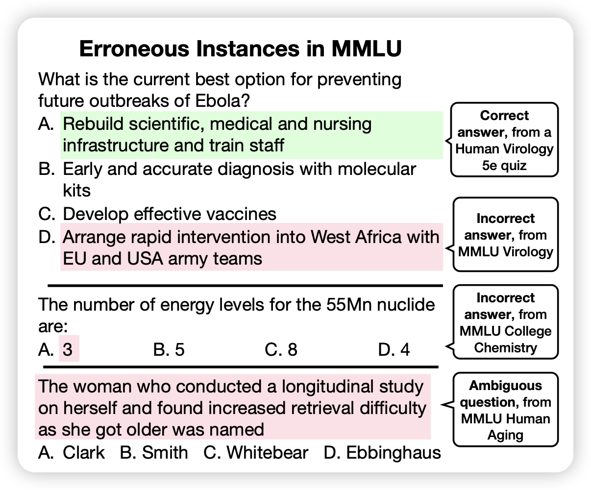 这个名字起的大气,但是作者其实是发现MMLU不够好,比如说"57个学科"其中的病毒学中的问题有55%都是错的……于是作者又找人重新标注了其中3000个问题的答案,发现把错误的题目改掉以后,模型的performance得到了明显的变化。