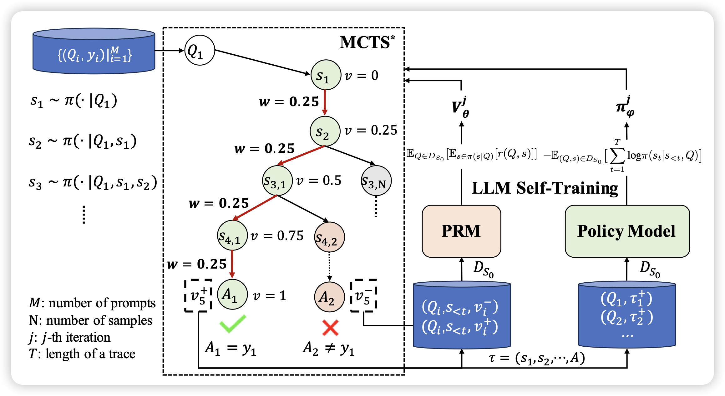 唐杰老师的文章,结合了之前的math-shepherd和ReFT:作者用一个树搜索算法搜出来不同的解决方案,然后由score决定是正/负样本,进而进行dpo之类的self-train算法,在几个reasoning场景下效果不错