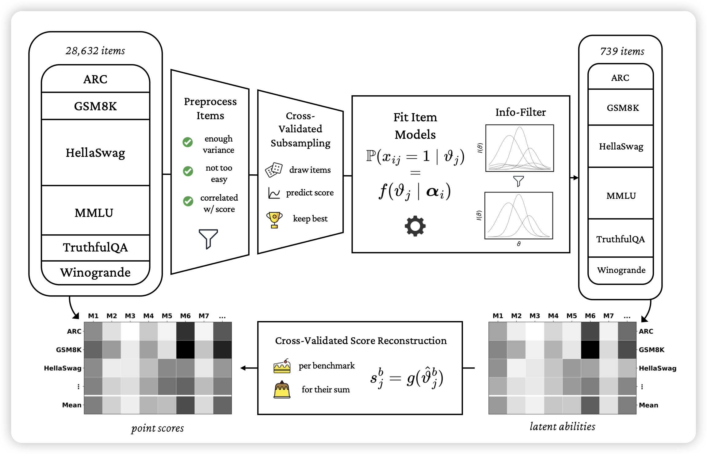 我很喜欢的工作:如果大家还记得observational scaling law的论文,作者通过多个LLM在多个benchmark的得分直接分解出了每个benchmark的特征值,再做scaling prediction。这篇工作在instance-level做,作者认为目前的benchmark有很多的冗余、重复的知识,能不能在已有benchmark上找到一个子集,使得只用子集的得分就能确定完整benchmark的得分呢?作者发现,只用3%的数据就能得到接近99%的准确率……