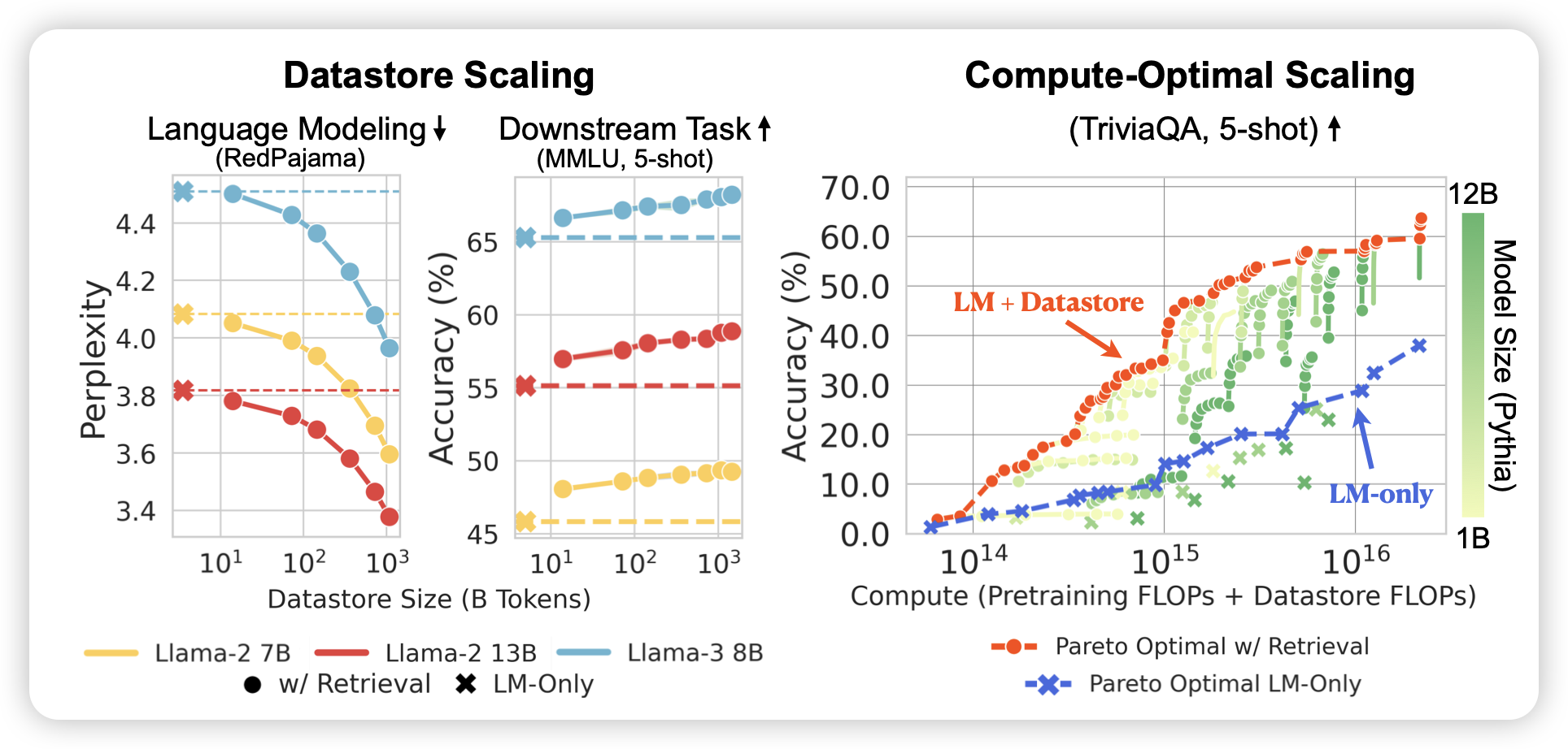 刘奕群老师之前做过一个RAG的scaling law研究,刚刚拿了best paper。今天这个也是研究RAG中的dataset-size scaling,更进一步,作者还研究了同时考虑训练flop和inference flop下的最优模型参数,发现和LLM-only的模式是不同的。