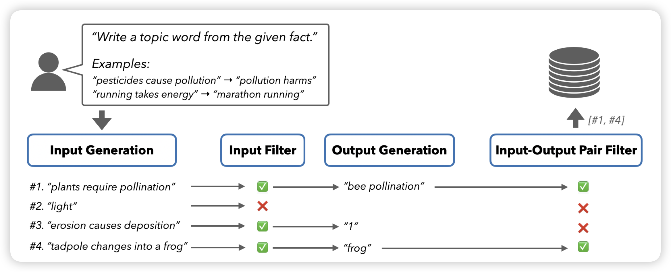 Neubig的工作,一篇合成数据的小品文章:作者认为在合成数据生成的过程中,最好不要依赖别的模型、也不依赖人。作者的思路是每个任务有一些input output pairs,然后由此构造更多的input output pair,最后生成更多的SFT数据