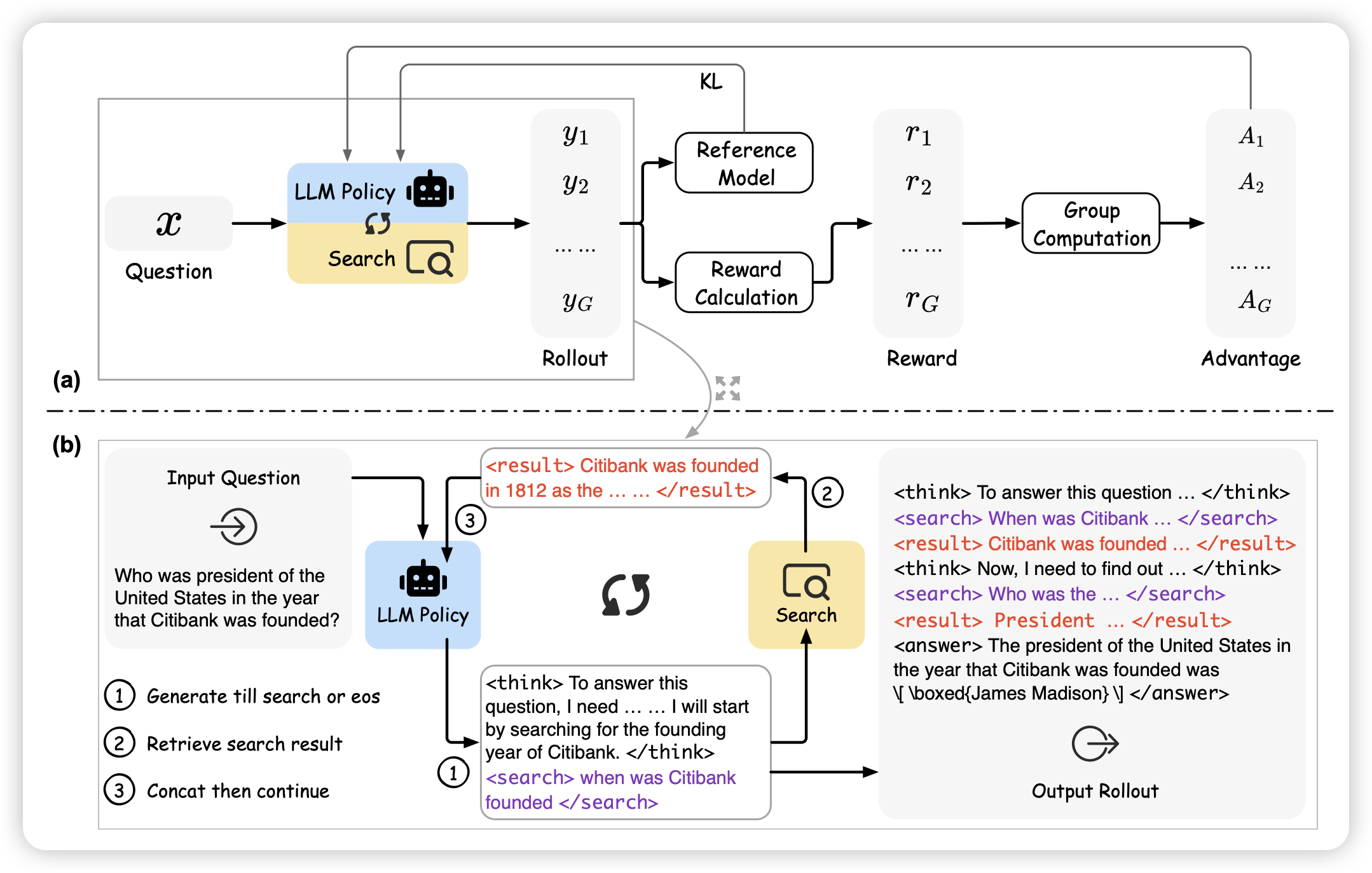 最近有一些做o1 + deep-research的工作,这篇算是看着比较顺眼的。作者行文有点致敬老前辈r1,然后就是在grpo里添加了一个search的action,揉在一起训练。把分摁上去了