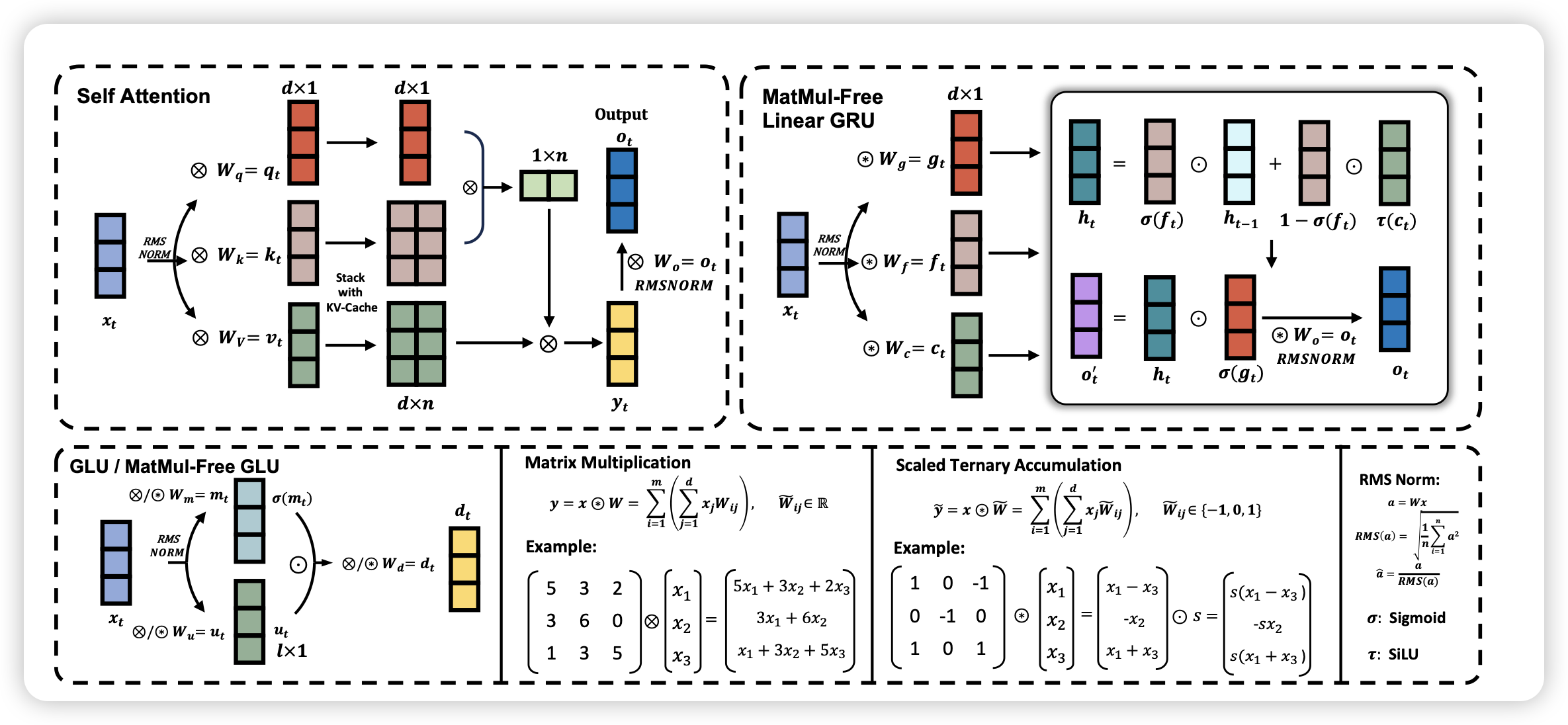 很硬核的论文,有一种不明觉厉的感觉:所谓了matmul-free是指,传统的LLM中得矩阵乘是时间和空间的大头。如果一个模型的前向整个都不使用矩阵乘,效果会怎么样呢?作者实现了2B的matmul-free model,发现在scaling曲线上,越大的matmul-free模型和传统模型的差距就越小。最后,作者在一个FPGA上实现了高效算子,只需要13w就能跑起来2B的matmul-free model。