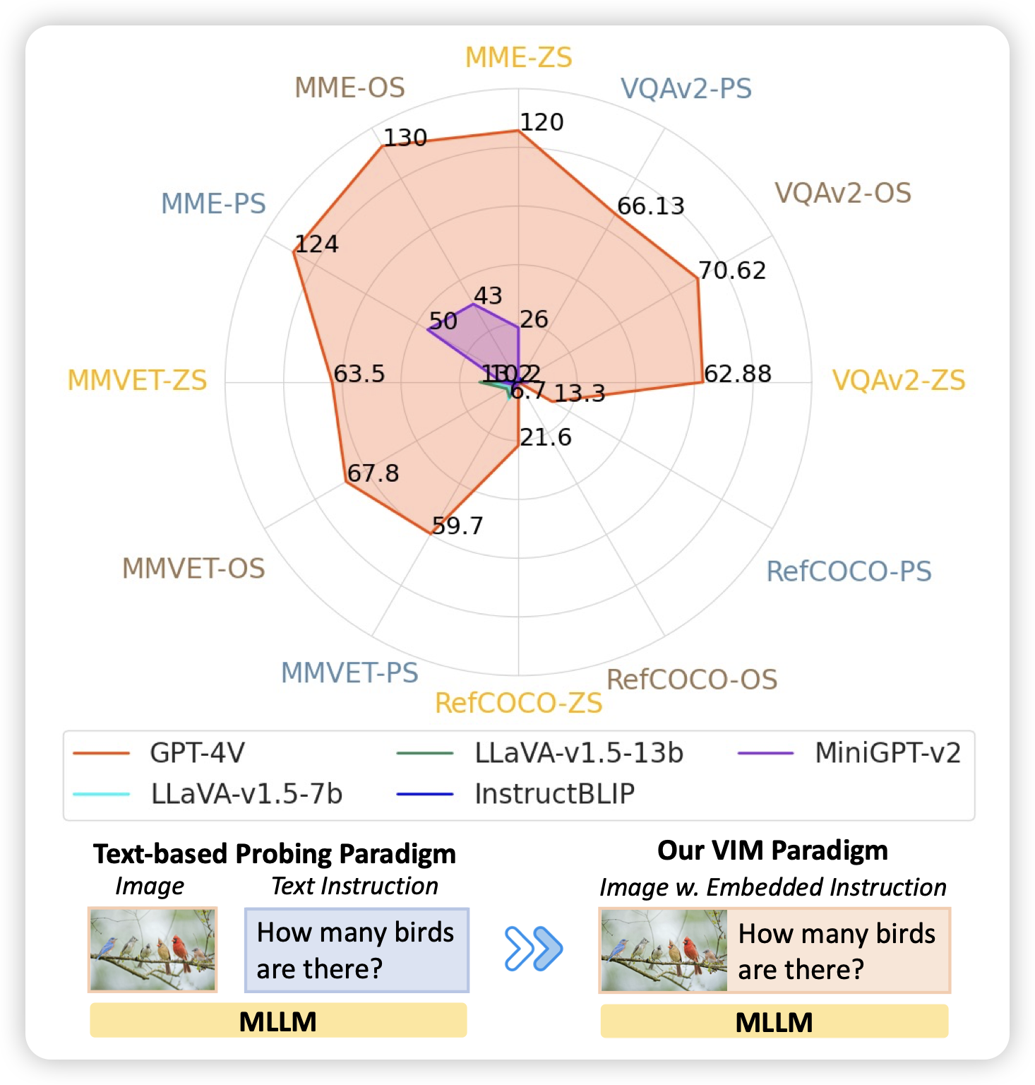 Yejin Choi的论文,作者想了个怪招:如果把MLLM task中的文本instruction用图片的形式和原始图片拼在一起会怎么样?把常见的VQAv2, MME, MM-Vet, and Ref- COCO等任务都这么搞了一遍,发现除了GPT-4V以外的模型全傻了……这说明实际上开源模型和4V差距比想象中大呀