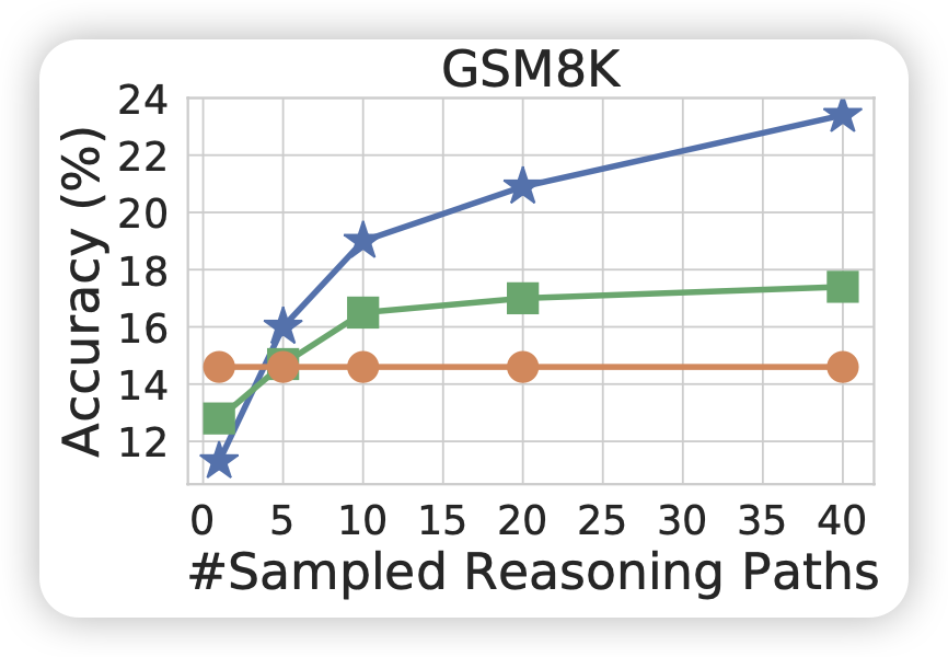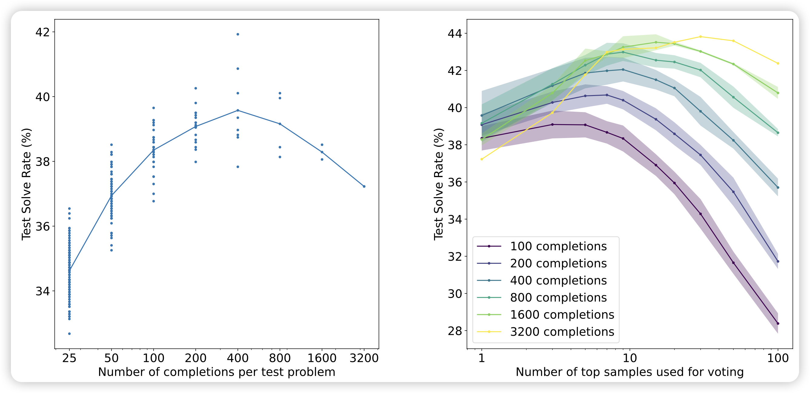 实际上,self-consistency是一个时间检验的算法,对于各种场景都能几乎稳定地获得提升。早在2021年OpenAI的GSM8K论文,就报告了类似的结果:他们先使用打分器选出最高的topk个样本,再在他们之中选择Major-voting的结果(下右图),效果比单纯对打分器选择top1的效果好很多