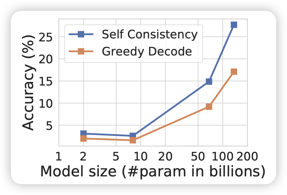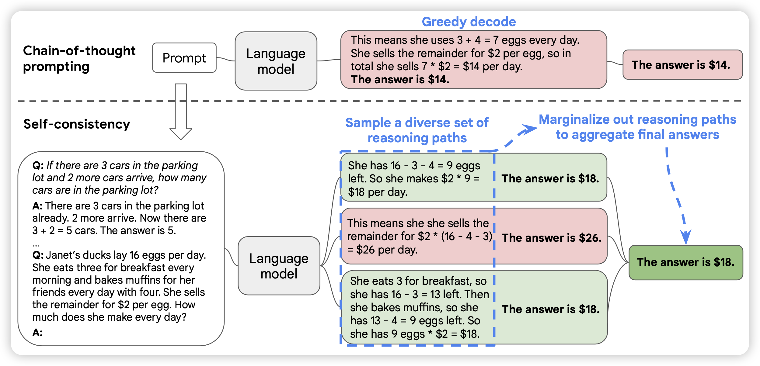而self-consistency则更进一步,如果用更多的CoT放到一起,能不能进一步提高效果?具体来说,模型按照某种随机解码算法,比如p-sample进行多次解码,最后根据多个结果做去重,最后给出众数作为结果。一个经典的例子就是数学计算题