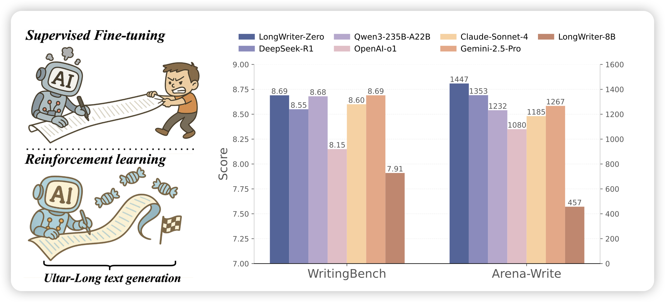 lijunzi的老师的工作,是超长文本生成。这是一个类似r1-zero的工作,作者在pure-rl setting(没有冷启数据)下,把qwen 32B的分数训上去了
