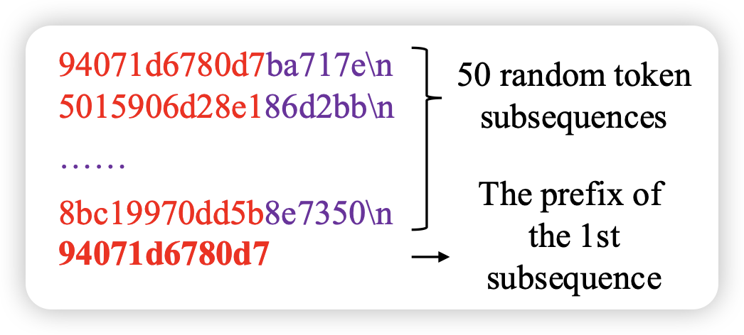 作者探索了LLM在训练中学习copy的能力:从context中直接找到一些片段来抄袭。像下面这个sample,上下文是50组随机数(有些组是重复的),然后输入其中一个的前缀,比较牛的模型可能就会发现降低ppl的好方式是抄袭前面出现过的串。作者发现不同训练阶段模型的表现类似于grokking现象:在训练集上很快过拟合,在测试集表现一坨;但是过了很久以后,在测试集上突然领悟了