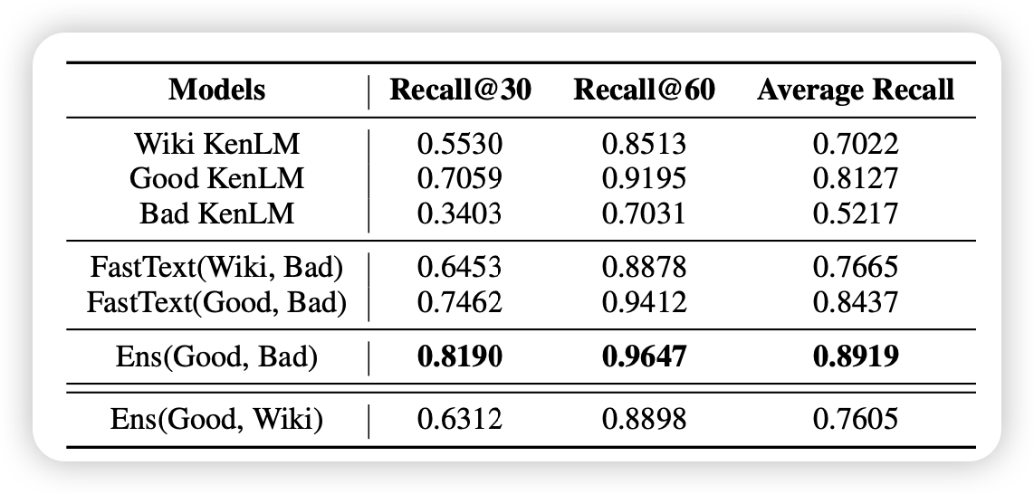 一篇挺专的论文:如何从预训练语料里挖掘高质量数据。已有工作kenlm的方案是用一个在高质量语料上训练的n-gram LM作为数据筛,作者认为这种方案只看到了好的语料,没看到坏的语料,没有对比学习的思路在里面。所以作者训练了两个kenlm,一个在好语料一个在坏语料,综合两个模型的结果,最终的筛选质量比fasText高。