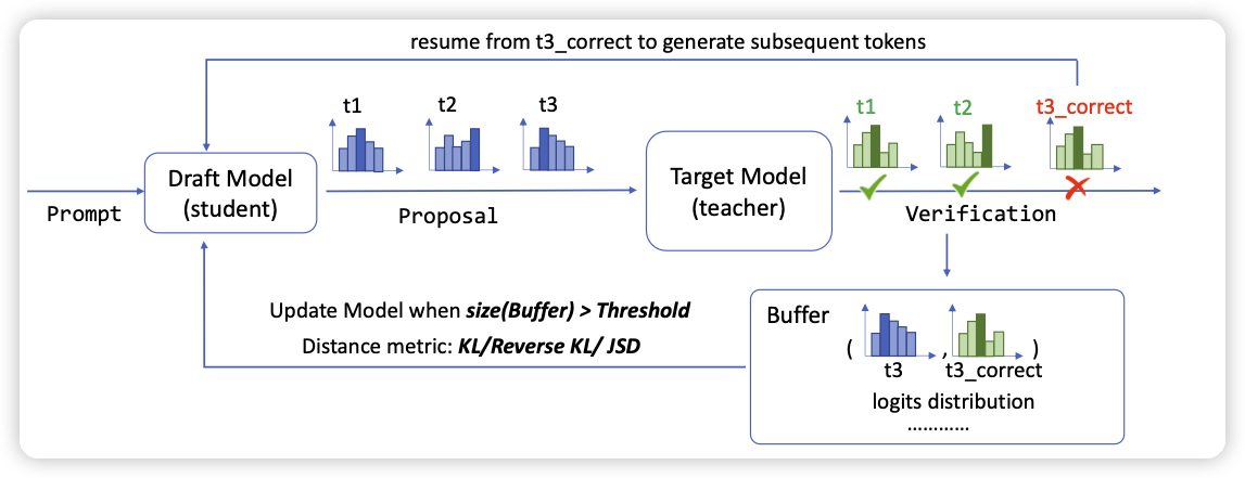 在投机推理的场景,都是由小模型生成样本,由大模型决定是否采用。在实际应用中,user query往往来源于一个同质化的分布,小模型错的地方也有相似性。作者发现目前系统的效率很低,因为小模型是固定的。因此想要做在线的部署,对于错误的预测都记录下来,当做一个训练数据。每当数据集超过阈值,就更新一波小模型。