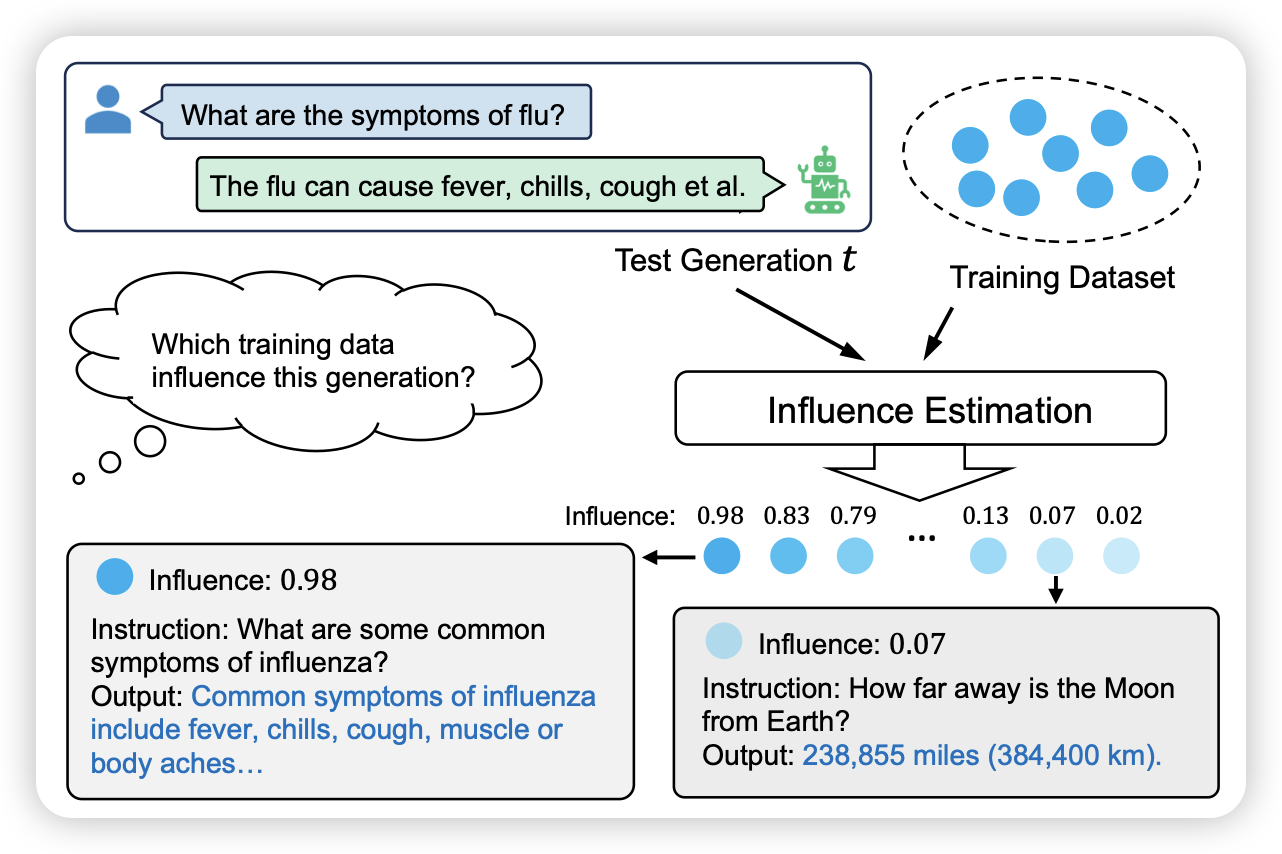 这篇是influence function research line的论文:作者想要找到模型的每个输出里,对他影响最大的训练数据是什么。这次的方案是把训练数据里的梯度用某种方法压缩存起来,然后可以用一个模型retreive回来影响最大的数据。