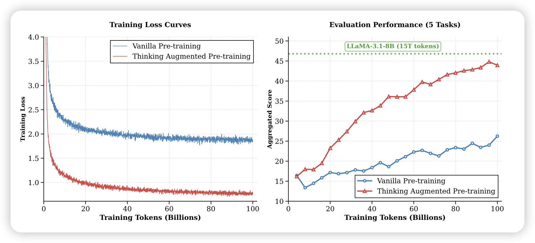 最近连续刷到几篇在预训练阶段,改变训练模式,通过thought augment,或者干脆直接就做on-policy rl的工作。这些新的方法,和从2020年开始大家就在做的paraphrase/synthetic有本质区别吗?是比pretrain模式更好的模式吗?当然,这几篇工作在算力等级上存在明显的差距,所以没法直接对比。而且这种级别的设计差异其实也是没法对比的,变量太多,大家一般只能选一种。今天我们只是来浅浅了解一下几种工作都是如何开展的吧
