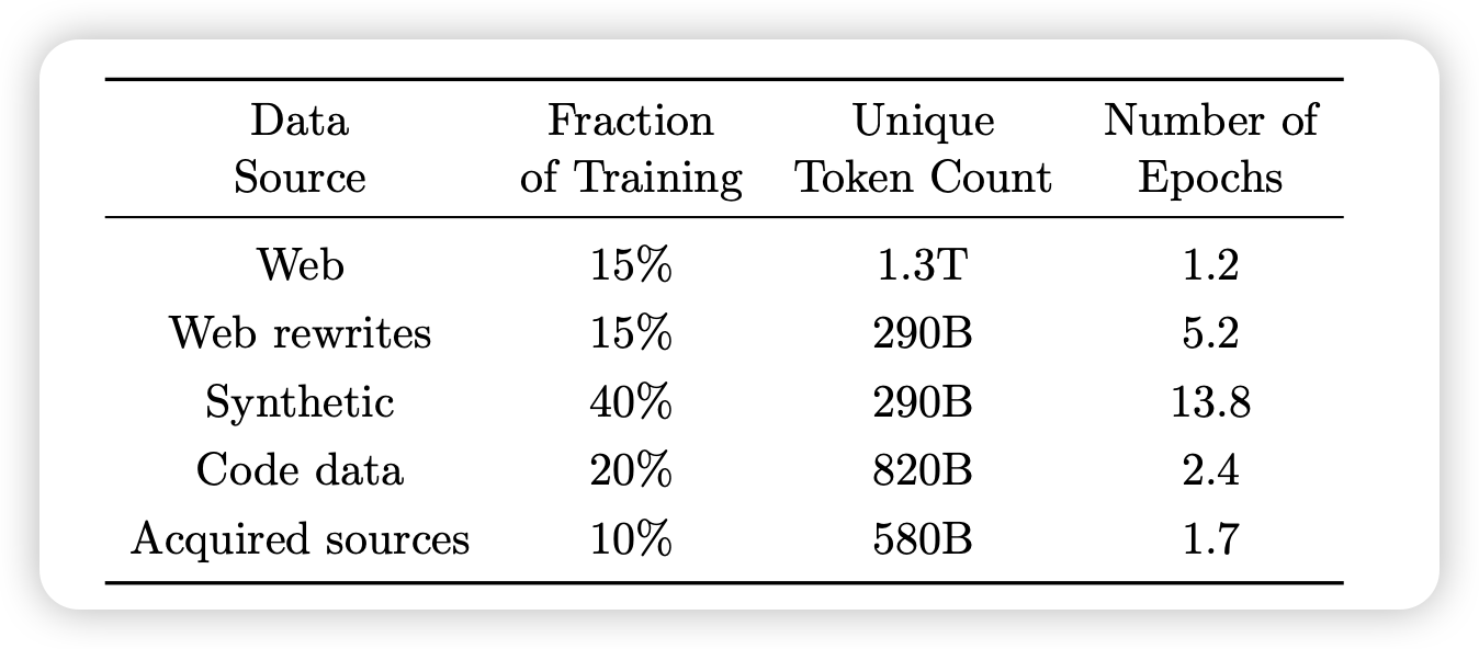 Phi系列模型,是这个领域中做的比较极端的例子:它作为一个14B的模型,却足足找 GPT4 写了300B token。而从他的recipe来看(注意每个数据源,都需要用 unique-token \(\times\) epoch做计算),40%来自于合成数据,15%来自于praphrase,(20% code是保住code能力必须的东西),而原始互联网语料只剩下了15%. 从结果来说,phi-4很强,作为一个2024年底放出来的开源模型工作,现在都到2025年下半年了,同参数量的新出的模型,仍然不太敢把phi4作为baseline去对比。很多时候,一个简单的招数,在花了很多钱以后,还是很好用的。