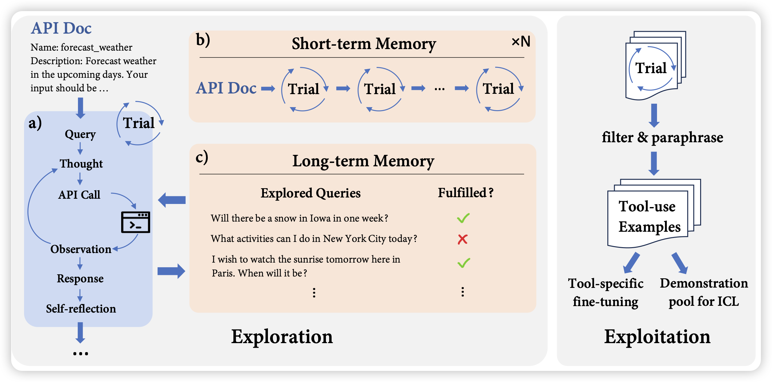 ToolLLM的质量挺不错的follow up工作:作者认为toolLLM对于单个tool,即使在训练集里的准确率也并不够好。实际上,这是因为训练集里可能有一些数据过期等问题。通过一个short term memory,让模型可以通过一些幻想出来的场景去试探,可以持续地为工具收集数据,用做后续的ICL或者finetune。通过这种方案,可以更好的维持模型工具调用能力